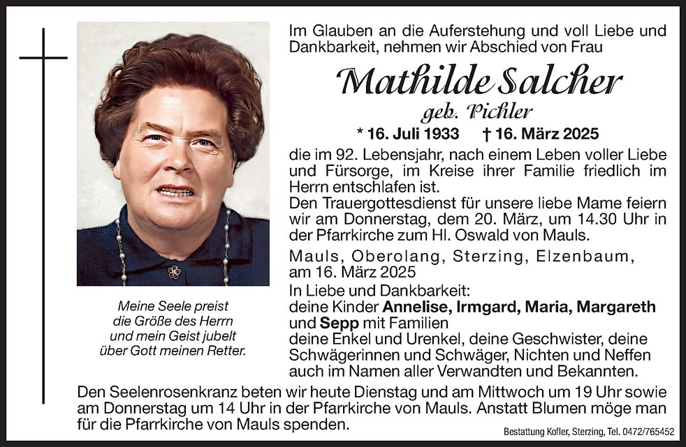 Den Trauergottesdienst für unsere liebe Mame feiern wir am Donnerstag, dem 20. März, um 14.30 Uhr in der Pfarrkirche zum Hl. Oswald von Mauls. Anschließend findet die Beisetzung im Ortsfriedhof statt.