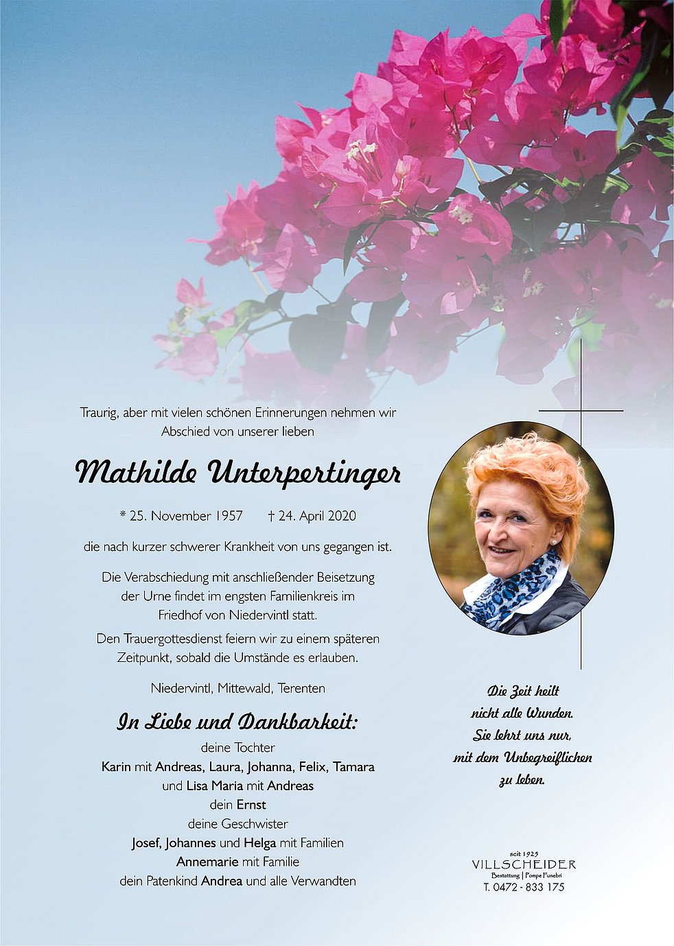 Mir winschn in olla Ungehörigen inso aufrichtigis Beileid, ruhe in Friedn Mathilde. Danke fir dei johrelonga Zusommenorbat mit inson Vorein.