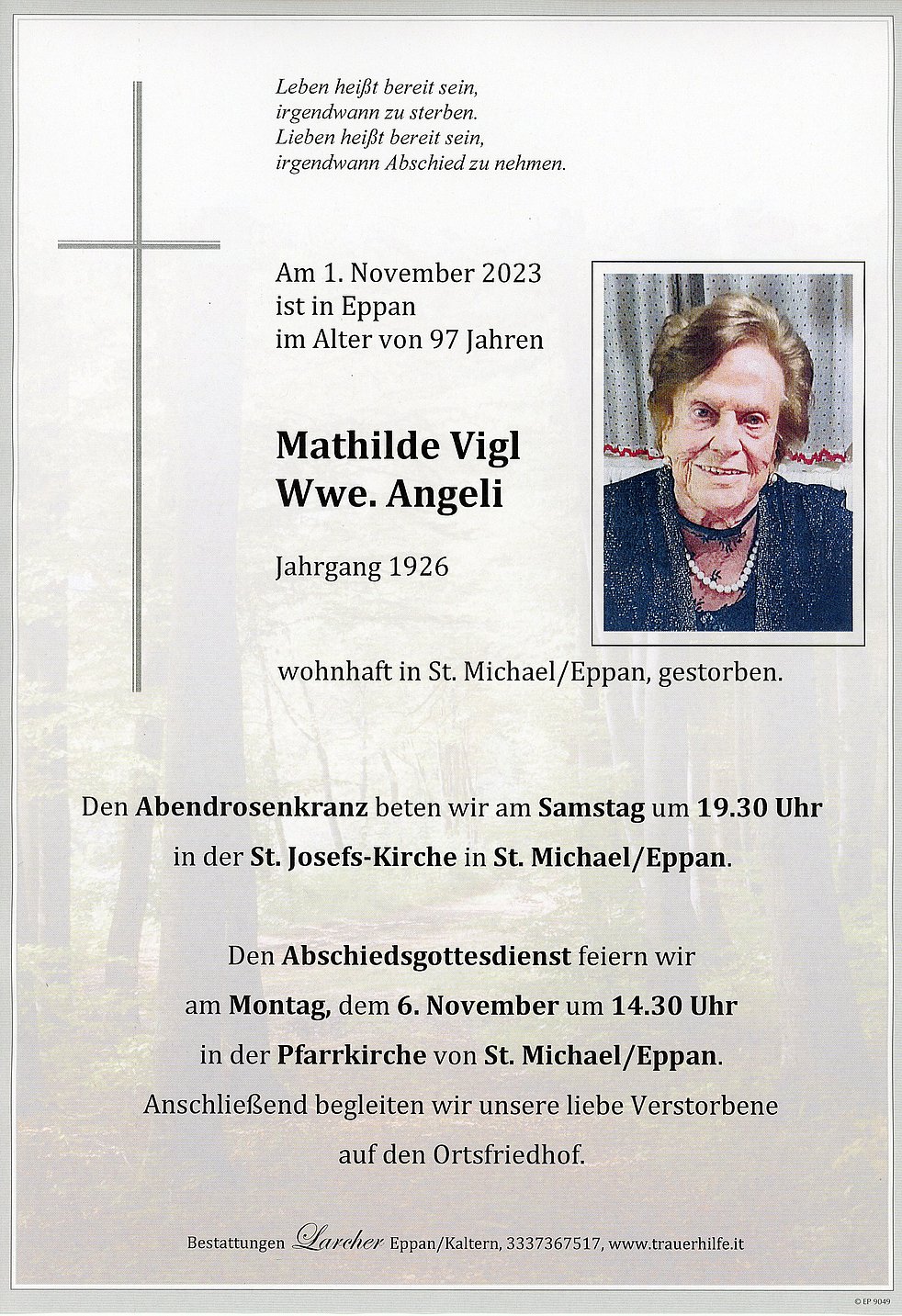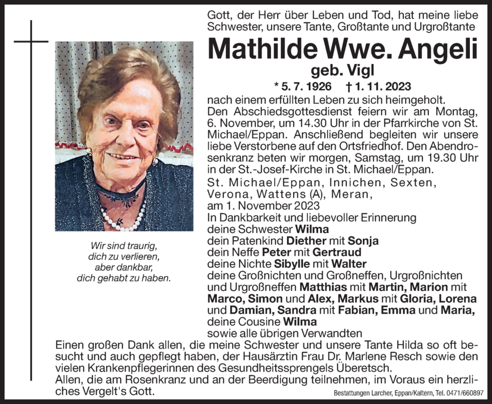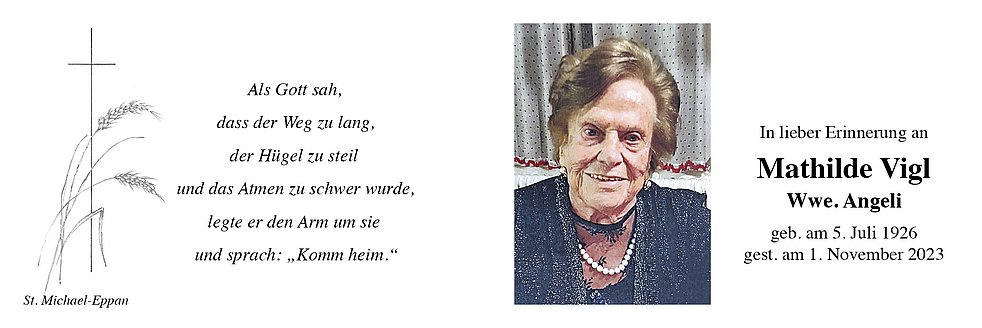 Den Abschiedsgottesdienst feiern wir am Montag, dem 6. November um 14.30 Uhr in der Pfarrkirche von St. Michael/Eppan. Anschließend begleiten wir unsere liebe Verstorbene auf den Ortsfriedhof.
