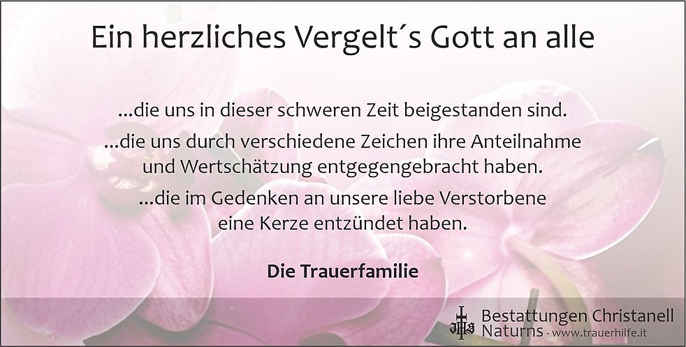 Ein besonderer Dank gilt Frau Dr. Birgit Platzer und den Krankenpflegern des Sprengels Naturns für die liebevolle Betreuung. Kathrin und Maria danken wir für all ihre Bemühungen. Ebenso gilt unser Dank all jenen, die unsere Mama in den letzten Jahren besucht haben – Vergelt's Gott!