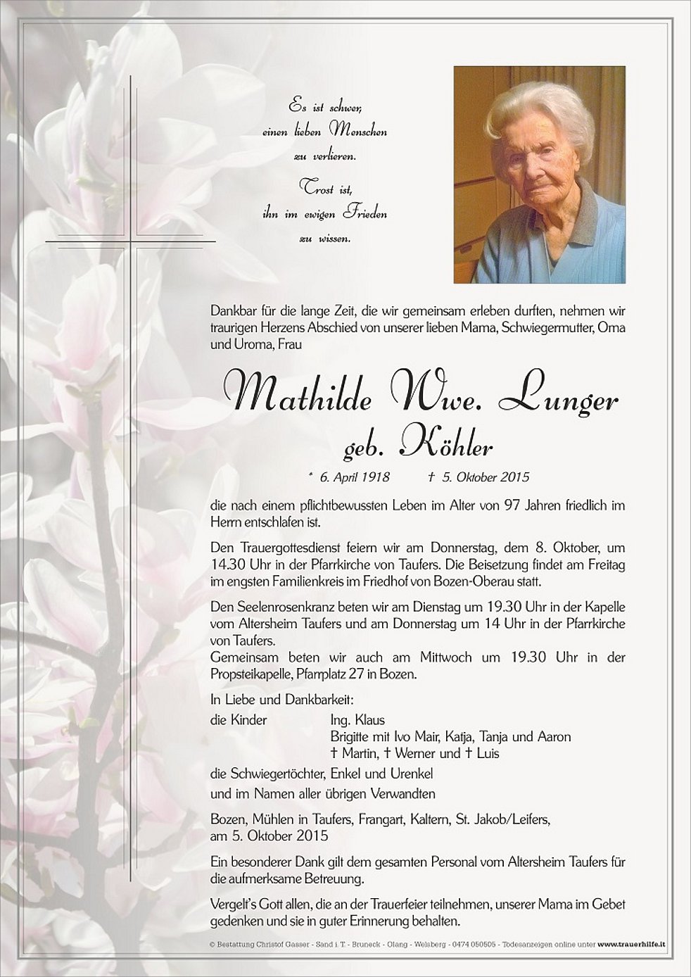 Den Trauergottesdienst feiern wir am Donnerstag, dem 8. Oktober, um 14.30 Uhr in der Pfarrkirche von Taufers. Die Beisetzung findet am Freitag im engsten Familienkreis im Friedhof von Bozen-Oberau statt.