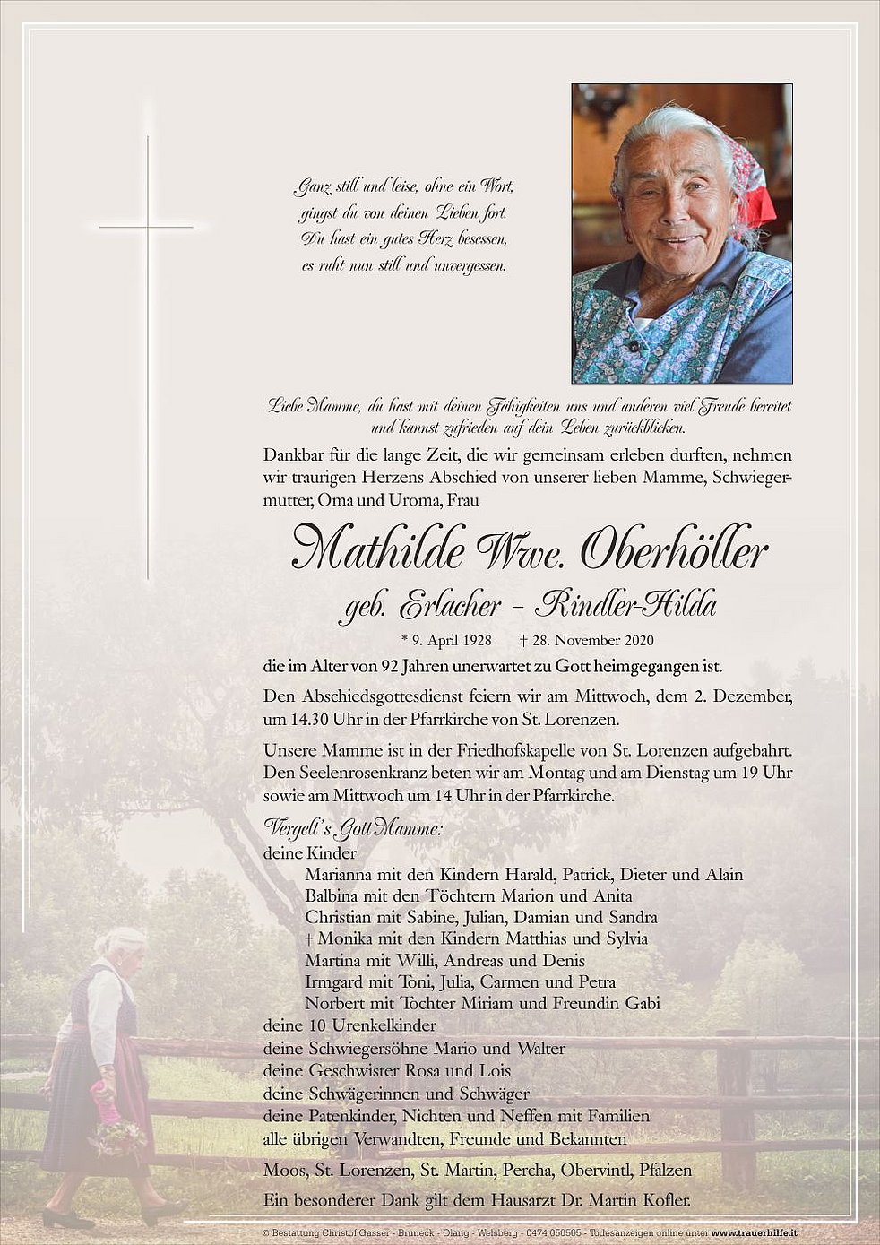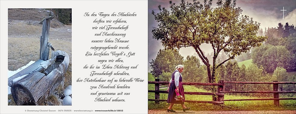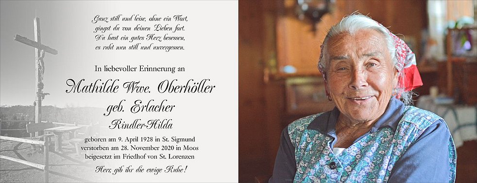 Unsere Mamme ist in der Friedhofskapelle von St. Lorenzen aufgebahrt. Den Seelenrosenkranz beten wir am Montag und am Dienstag um 19 Uhr sowie am Mittwoch um 14 Uhr in der Pfarrkirche.
