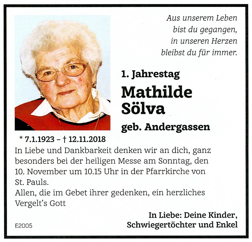 Anschließend begleiten wir unsere liebe Mathilde zur Beisetzung auf den Ortsfriedhof. Den Seelenrosenkranz beten wir am Donnerstag und am Freitag um 19.30 Uhr in der Pfarrkirche von St. Pauls.
