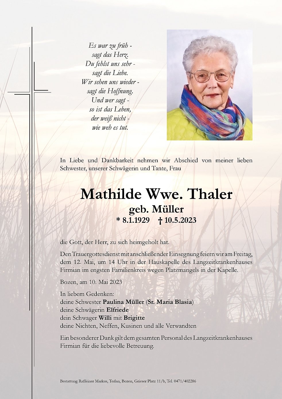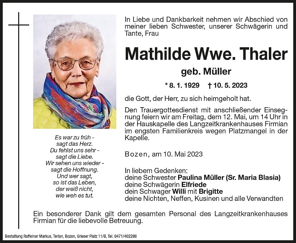 Den Trauergottesdienst mit anschließender Einsegnung feiern wir am Freitag, dem 12. Mai, um 14 Uhr in der Hauskapelle des Langzeitkrankenhauses Firmian im engsten Familienkreis wegen Platzmangels in der Kapelle.