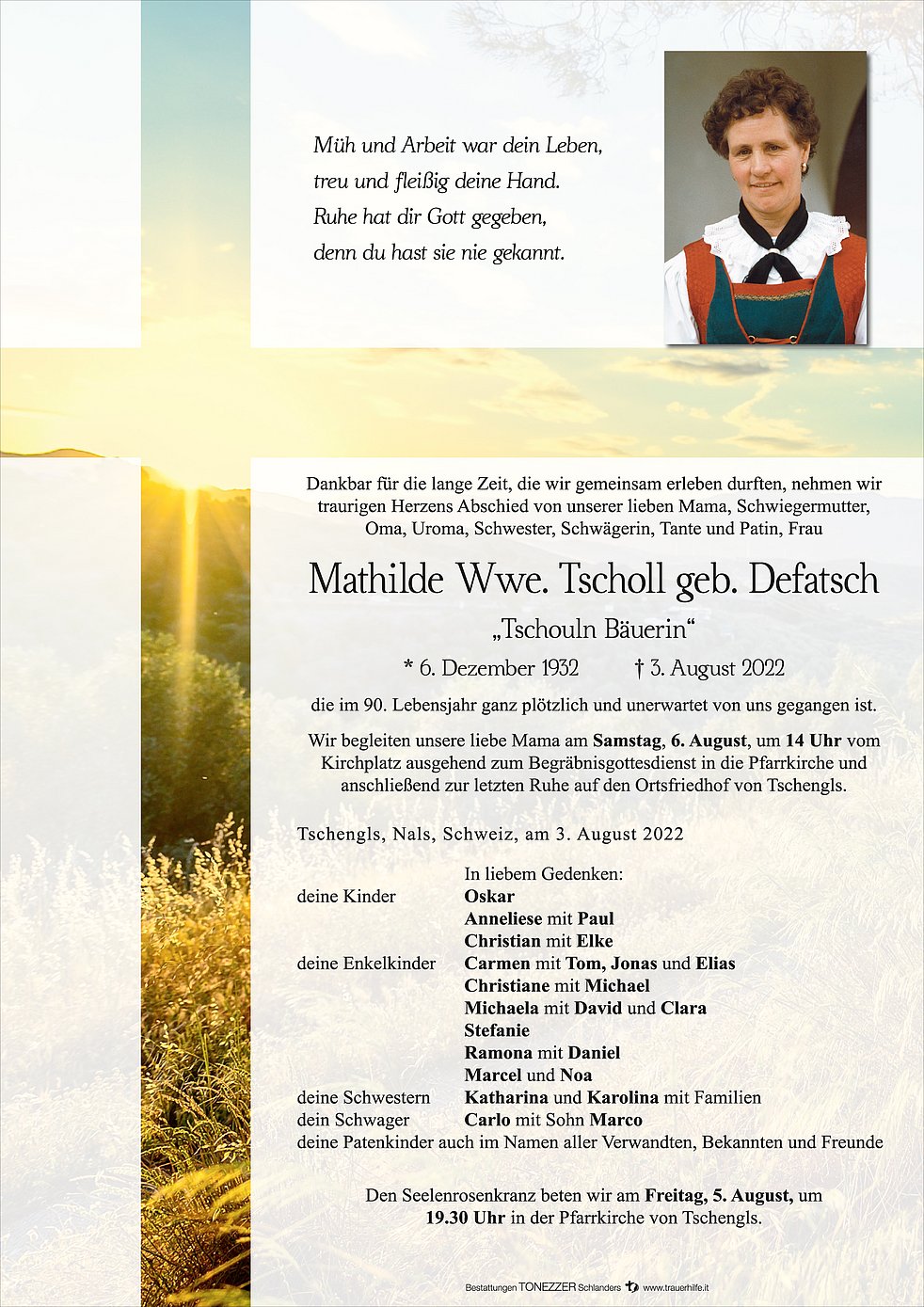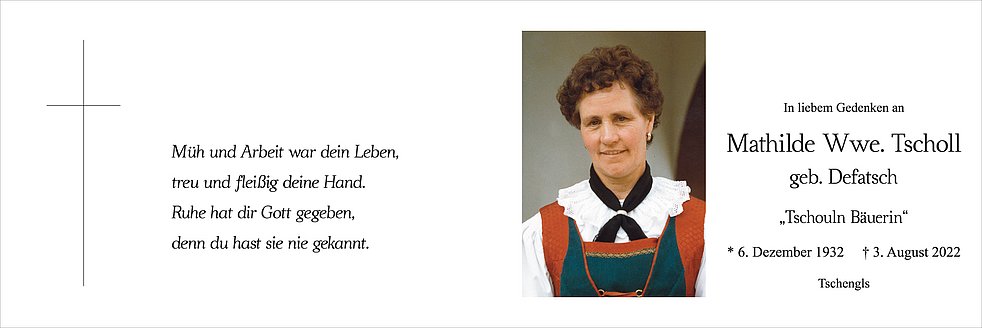 Wir begleiten unsere liebe Mama am Samstag, 6. August, um 14 Uhr vom Kirchplatz ausgehend zum Begräbnisgottesdienst in die Pfarrkirche und anschließend zur letzten Ruhe auf den Ortsfriedhof von Tschengls.