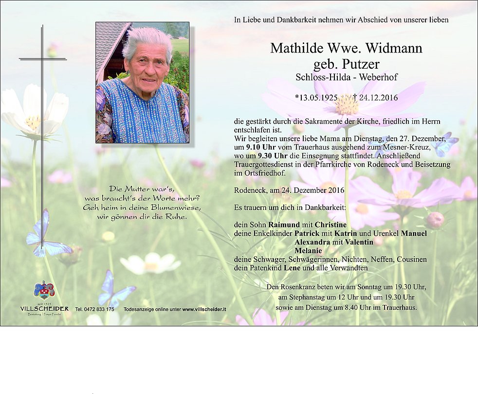 wo um 9.30 Uhr die Einsegnung stattfindet. Anschließend Trauergottesdienst in der Pfarrkirche von Rodeneck und Beisetzung im Ortsfriedhof.