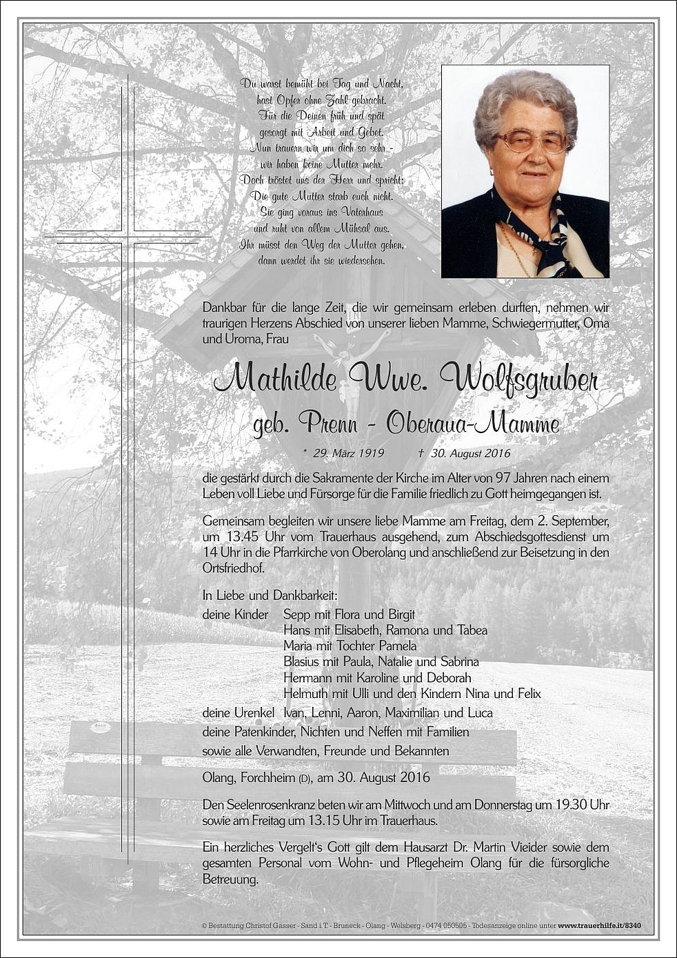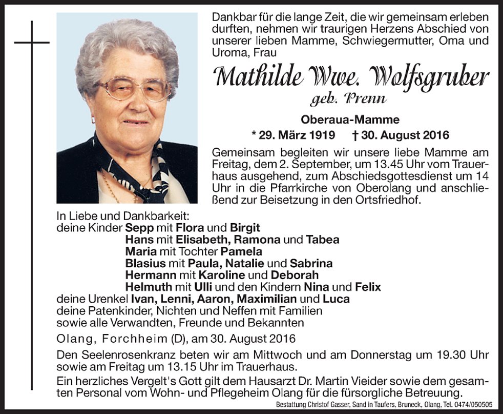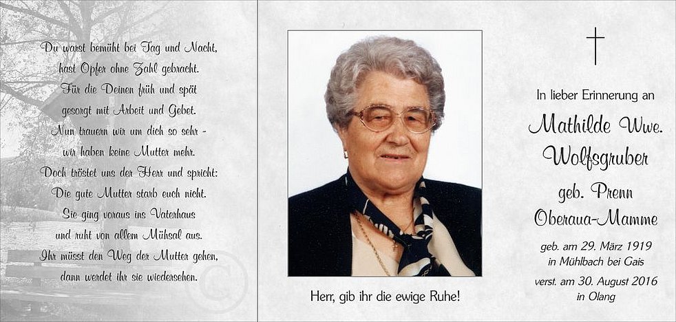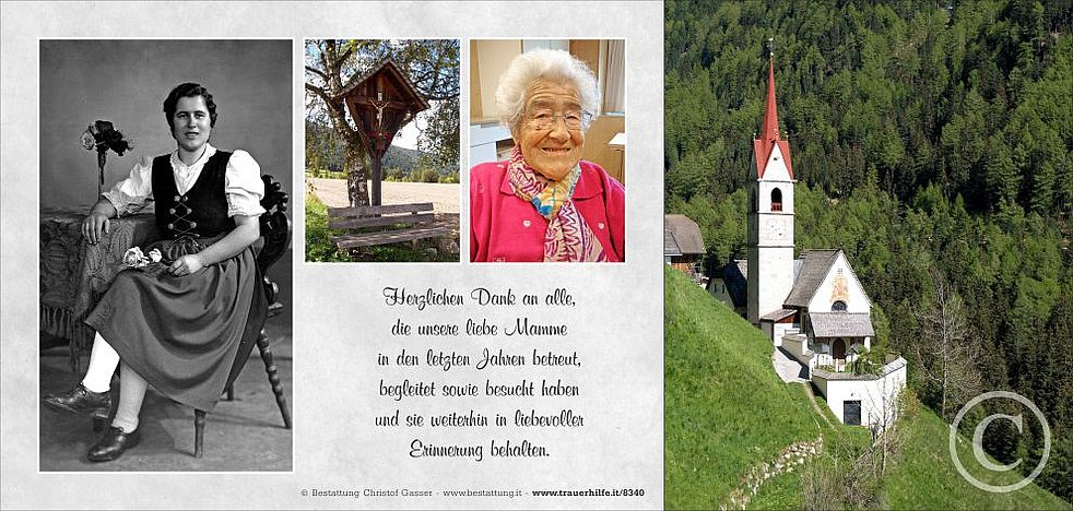 Gemeinsam begleiten wir unsere liebe Mamme am Freitag, dem 2. September, um 13.45 Uhr vom Trauerhaus ausgehend, zum Abschiedsgottesdienst um 14 Uhr in die Pfarrkirche von Oberolang und anschließend zur Beisetzung in den Ortsfriedhof.