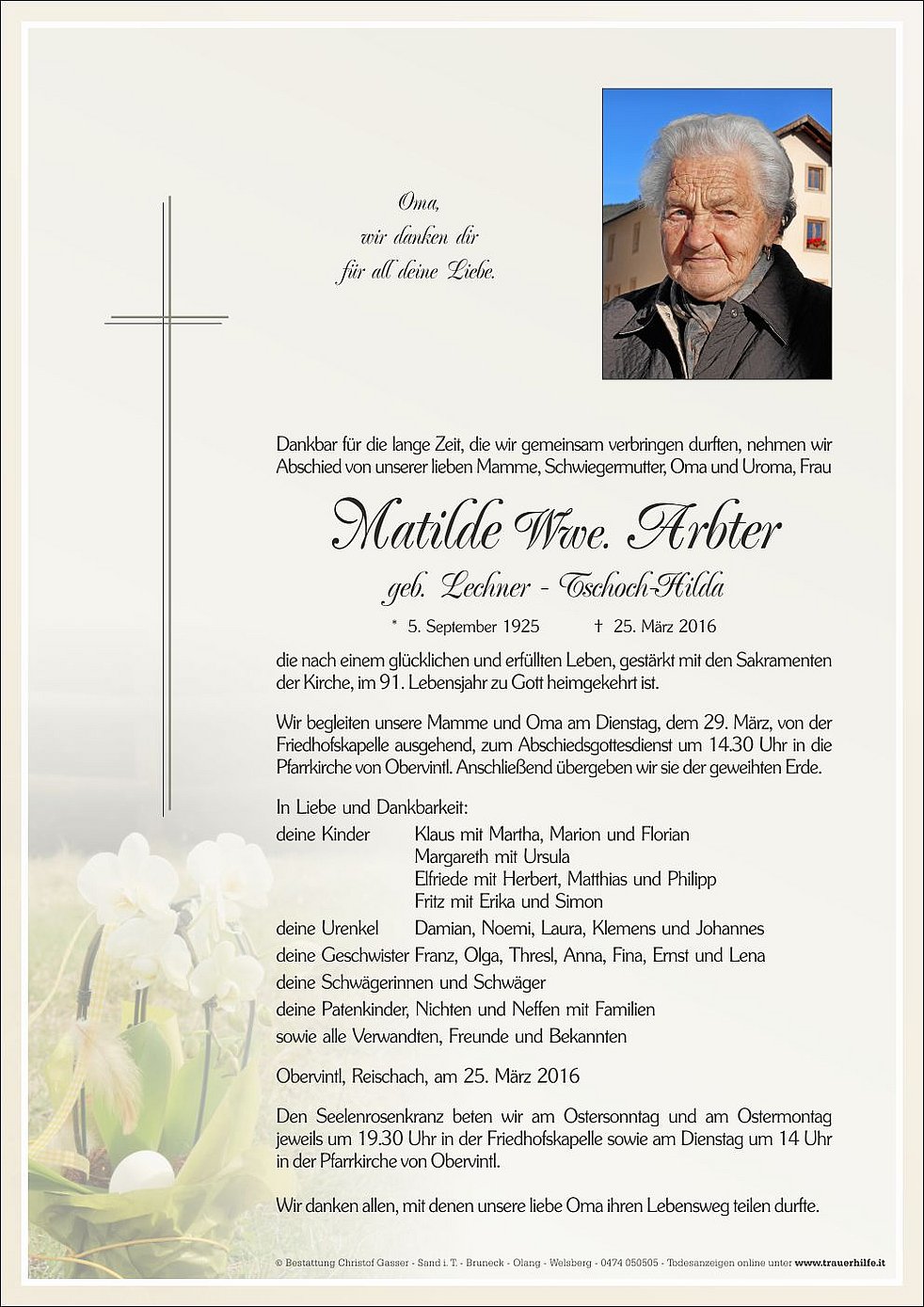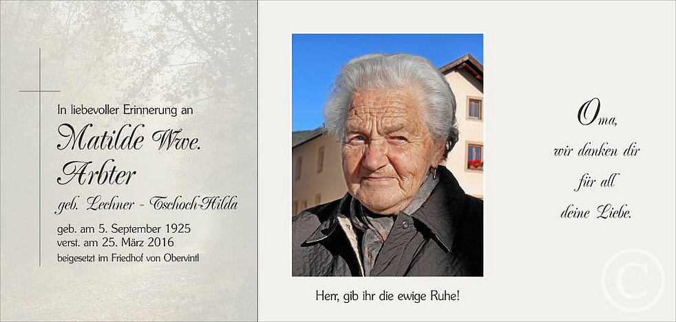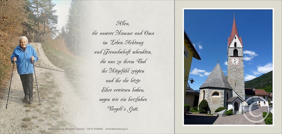 Wir begleiten unsere Mamme und Oma am Dienstag, dem 29. März, von der Friedhofskapelle ausgehend, zum Abschiedsgottesdienst um 14.30 Uhr in die Pfarrkirche von Obervintl. Anschließend übergeben wir sie der geweihten Erde.