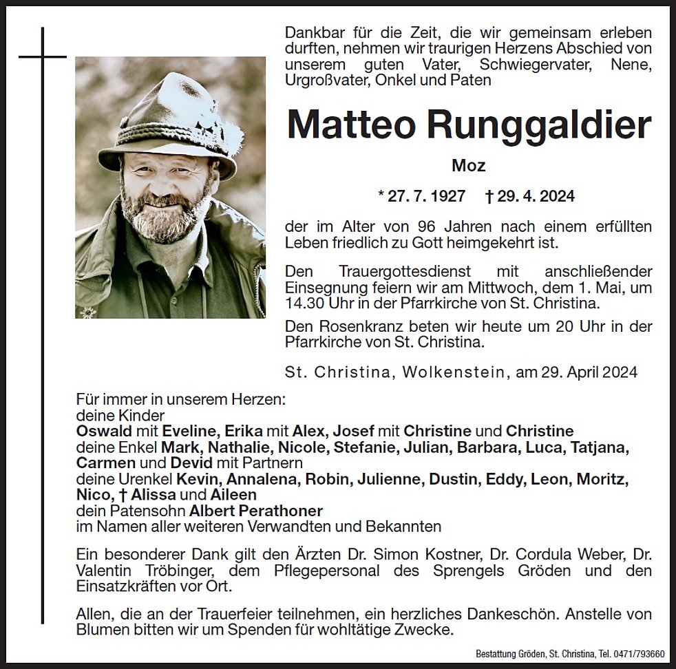 Ein besonderer Dank gilt den Ärzten Dr. Simon Kostner, Dr. Cordula Weber, Dr. Valentin Tröbinger, dem Pflegepersonal des Sprengels Gröden und den Einsatzkräften vor Ort.