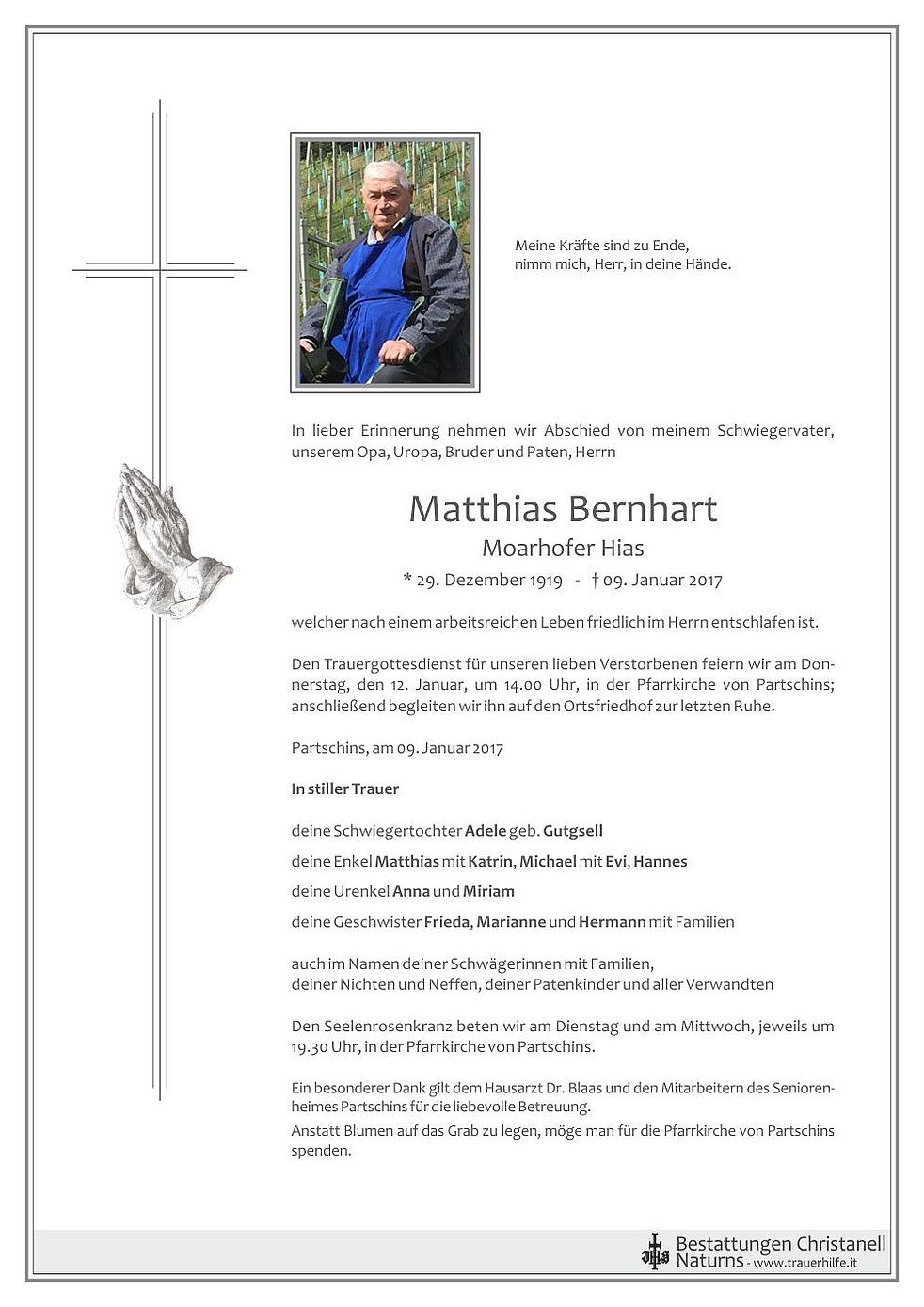 Den Trauergottesdienst für unseren lieben Verstorbenen feiern wir am Donnerstag, den 12. Januar, um 14.00 Uhr, in der Pfarrkirche von Partschins; anschließend begleiten wir ihn auf den Ortsfriedhof zur letzten Ruhe.