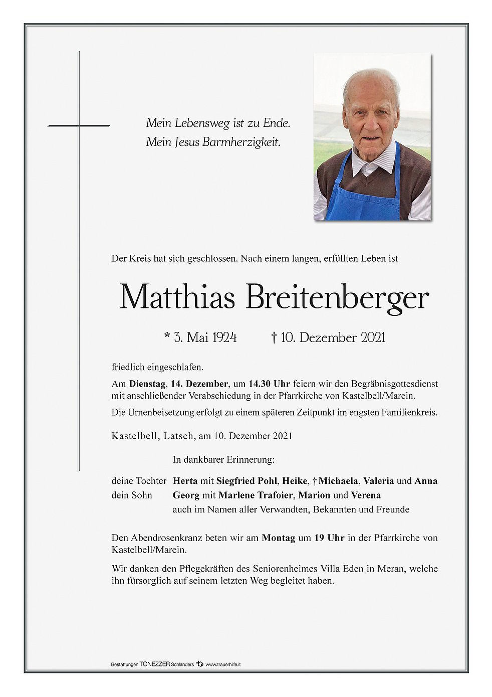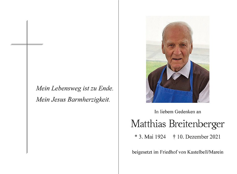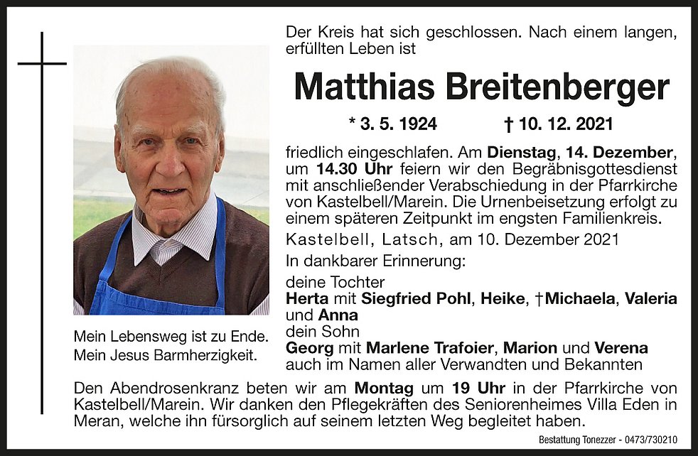 friedlich eingeschlafen. Am Dienstag, 14. Dezember, um 14.30 Uhr feiern wir den Begräbnisgottesdienst mit anschließender Verabschiedung in der Pfarrkirche von Kastelbell/Marein.