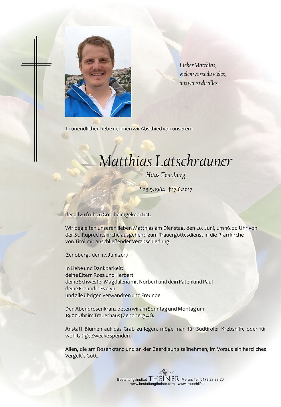 Wir begleiten unseren lieben Matthias am Dienstag, den 20. Juni, um 16.00 Uhr von der St. Ruprechtskirche ausgehend zum Trauergottesdienst in die Pfarrkirche von Tirol mit anschließender Verabschiedung.