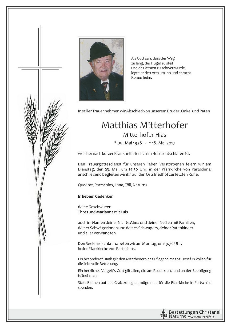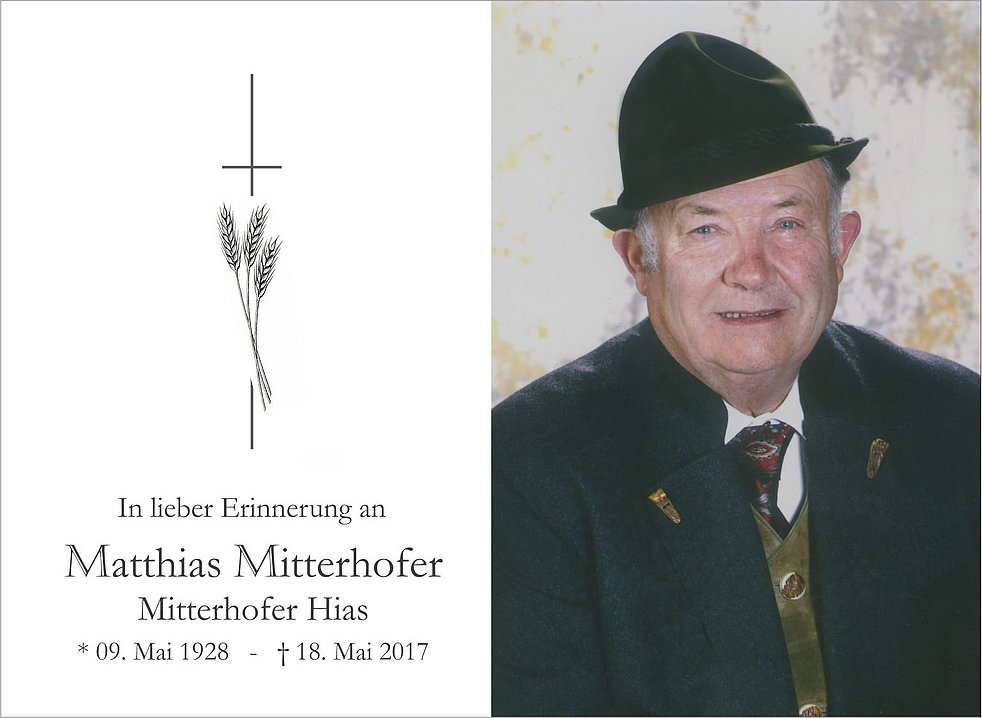 Den Trauergottesdienst für unseren lieben Verstorbenen feiern wir am Dienstag, den 23. Mai, um 14.30 Uhr, in der Pfarrkirche von Partschins; anschließend begleiten wir ihn auf den Ortsfriedhof zur letzten Ruhe.