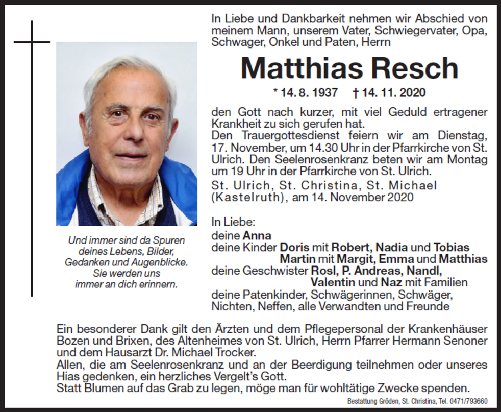 Den Trauergottesdienst feiern wir am Dienstag, 17.November, um 14.30 Uhr in der Pfarrkirche von St. Ulrich.