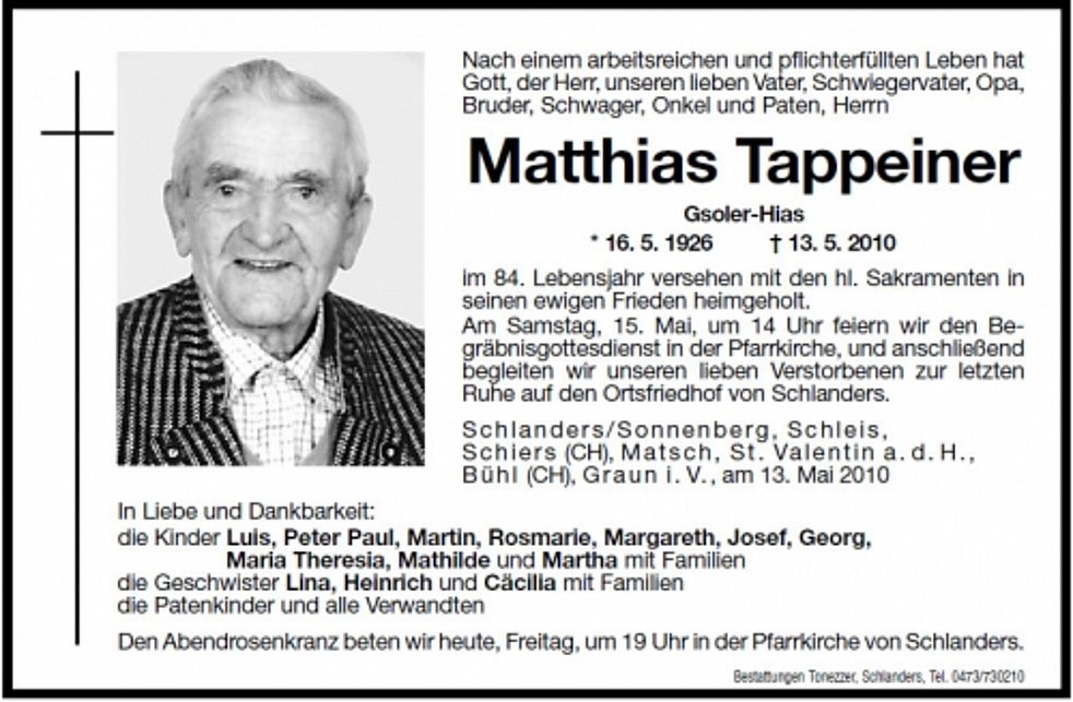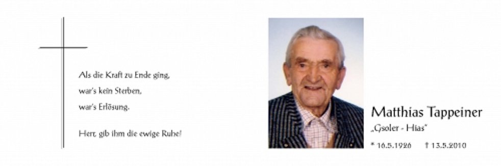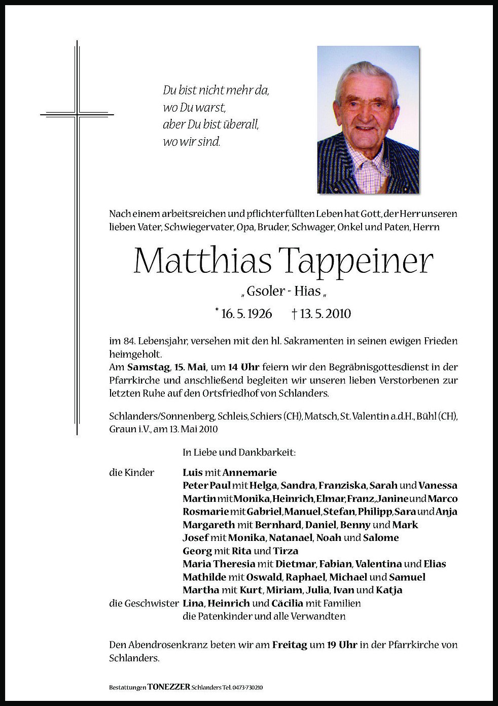 Am Samstag, 15. Mai, um 14 Uhr feiern wir den Begräbnisgottesdienst in der Pfarrkirche und anschließend begleiten wir unseren lieben Verstorbenen zur letzten Ruhe auf den Ortsfriedhof von Schlanders.