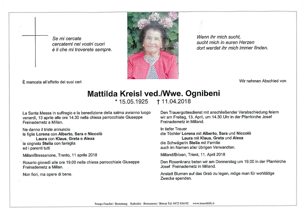 Besonders danken möchten wir unserer Hausärztin Dr. Veronika Dellasega für die liebevolle Begleitung und all denen, die unsere Mutter in letzter Zeit betreut haben, sowie allen, die am Rosenkranz und an der Verabschiedung teilnehmen.