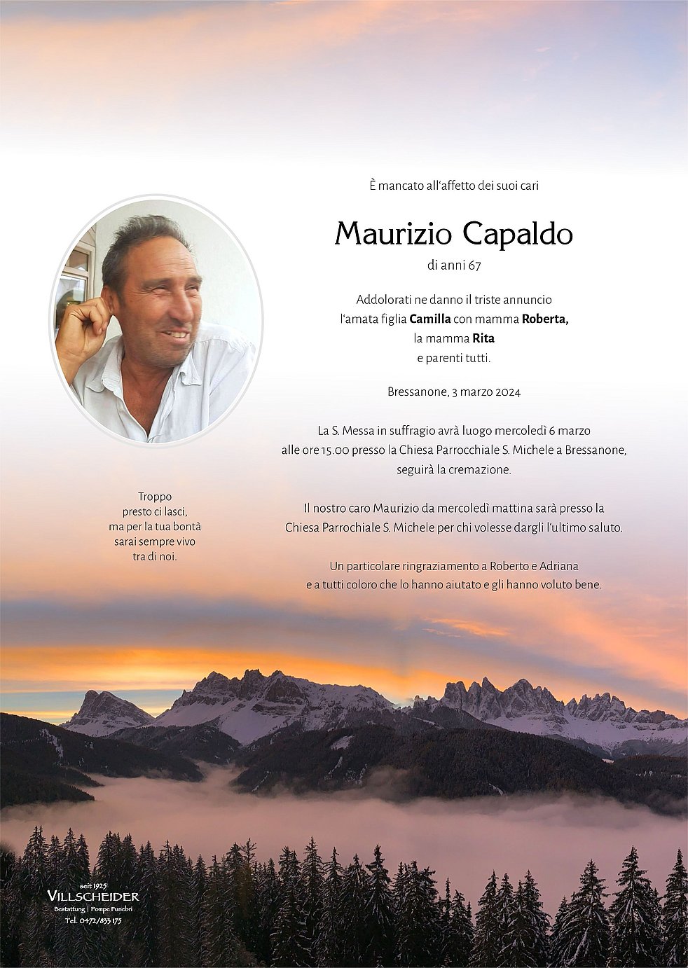 Begräbnisgottesdienst: 06.03. - 15:00 Uhr Brixen; Bressanone