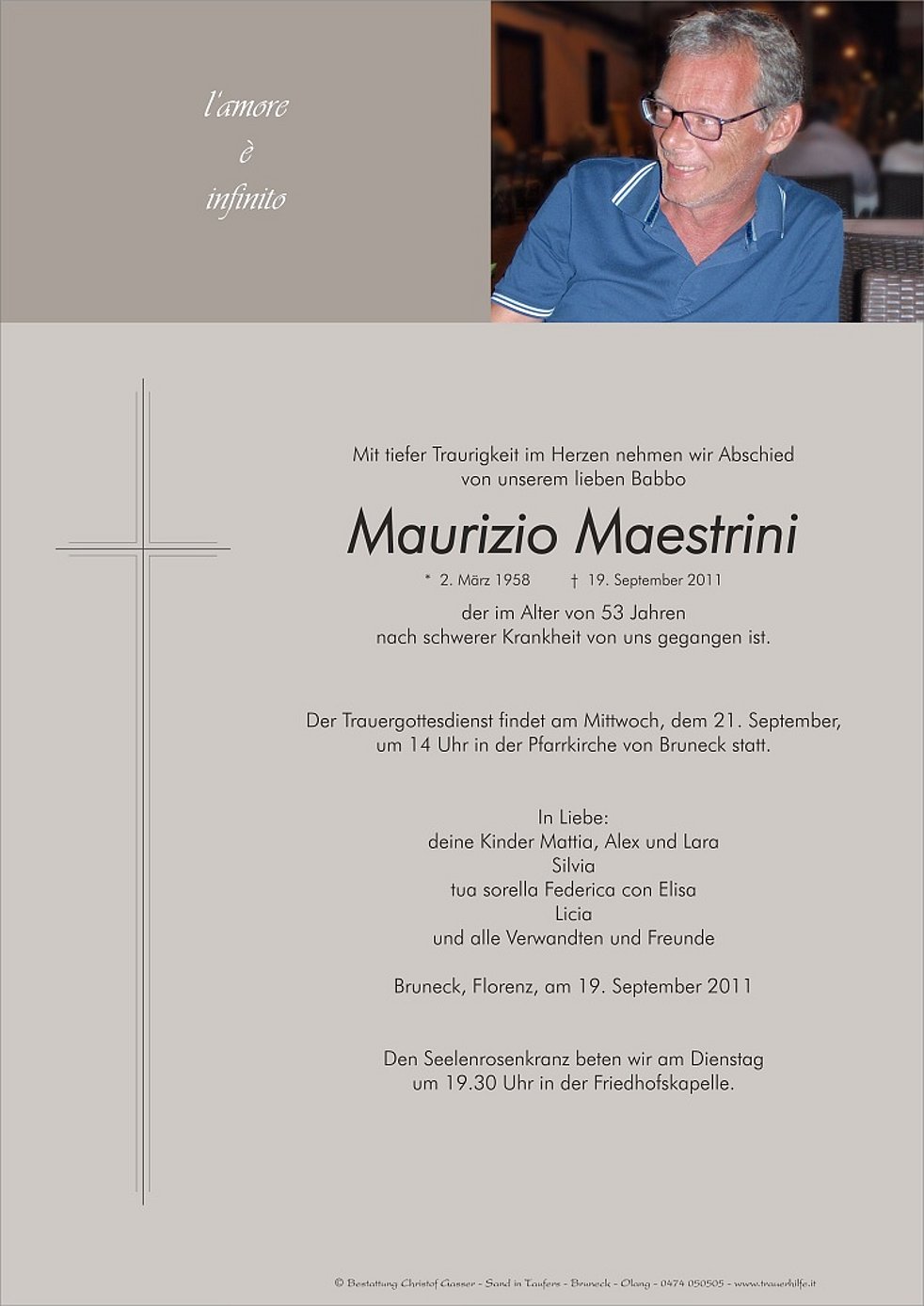 Der Trauergottesdienst findet am Mittwoch, dem 21. September, um 14 Uhr in der Pfarrkirche von Bruneck statt.
