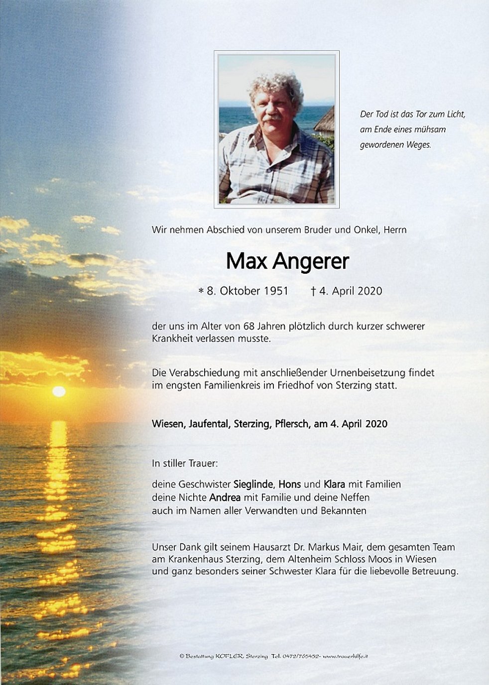 Unser Dank gilt seinem Hausarzt Dr. Markus Mair, dem gesamten Team am Krankenhaus Sterzing, dem Altenheim Schloss Moos in Wiesen und ganz besonders seiner Schwester Klara für die liebevolle Betreuung.