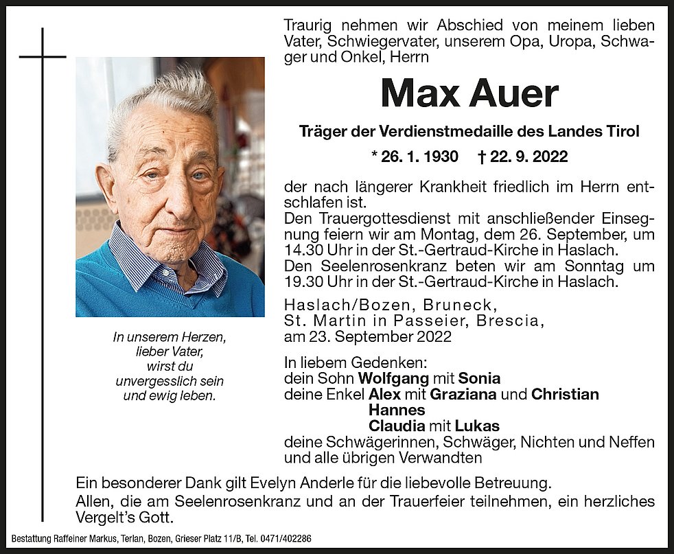 Den Trauergottesdienst mit anschließender Einsegnung feiern wir am Montag, dem 26. September, um 14.30 Uhr in der St.-Gertraud-Kirche in Haslach.