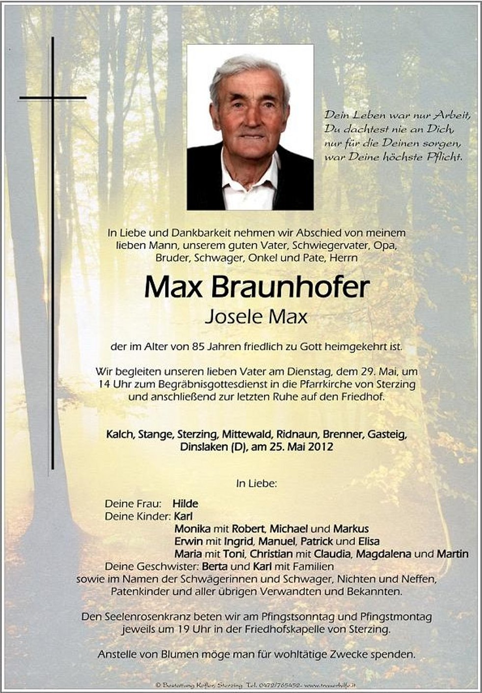 Anstelle von Blumen möge man für wohltätige Zwecke spenden.