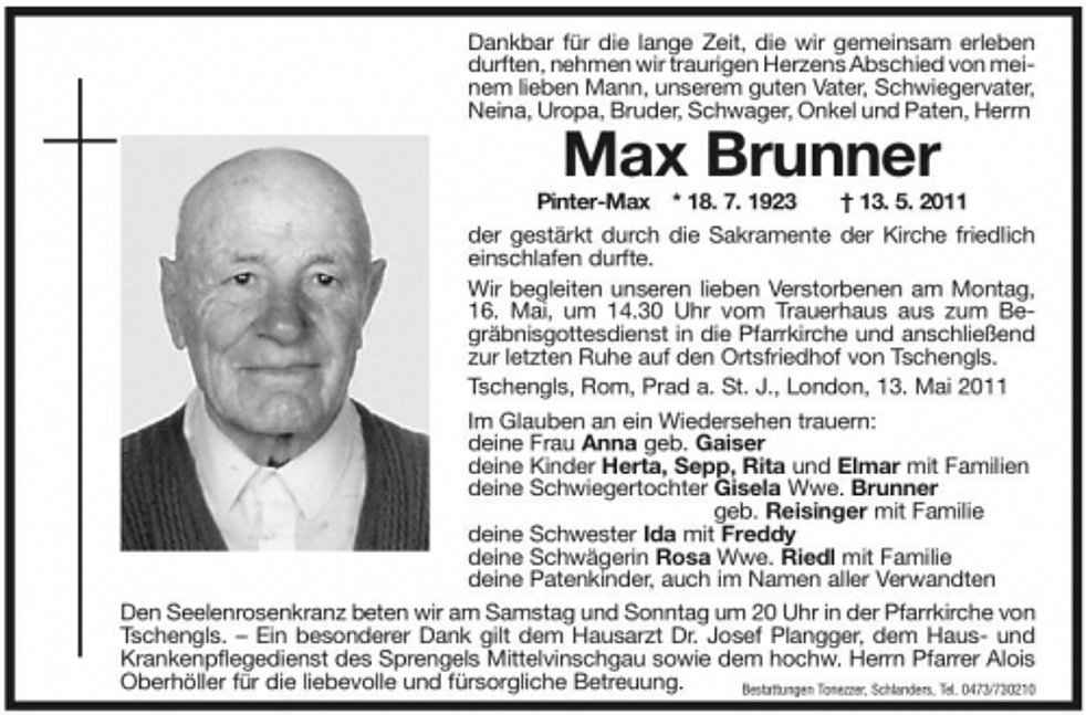 Ein besonderer Dank gilt dem Hausarzt Dr. Josef Plangger, dem Haus- und Krankenpflegedienst des Sprengels Mittelvinschgau sowie dem Hochw. Herrn Pfarrer Alois Oberhöller für die liebevolle und fürsorgliche Betreuung.