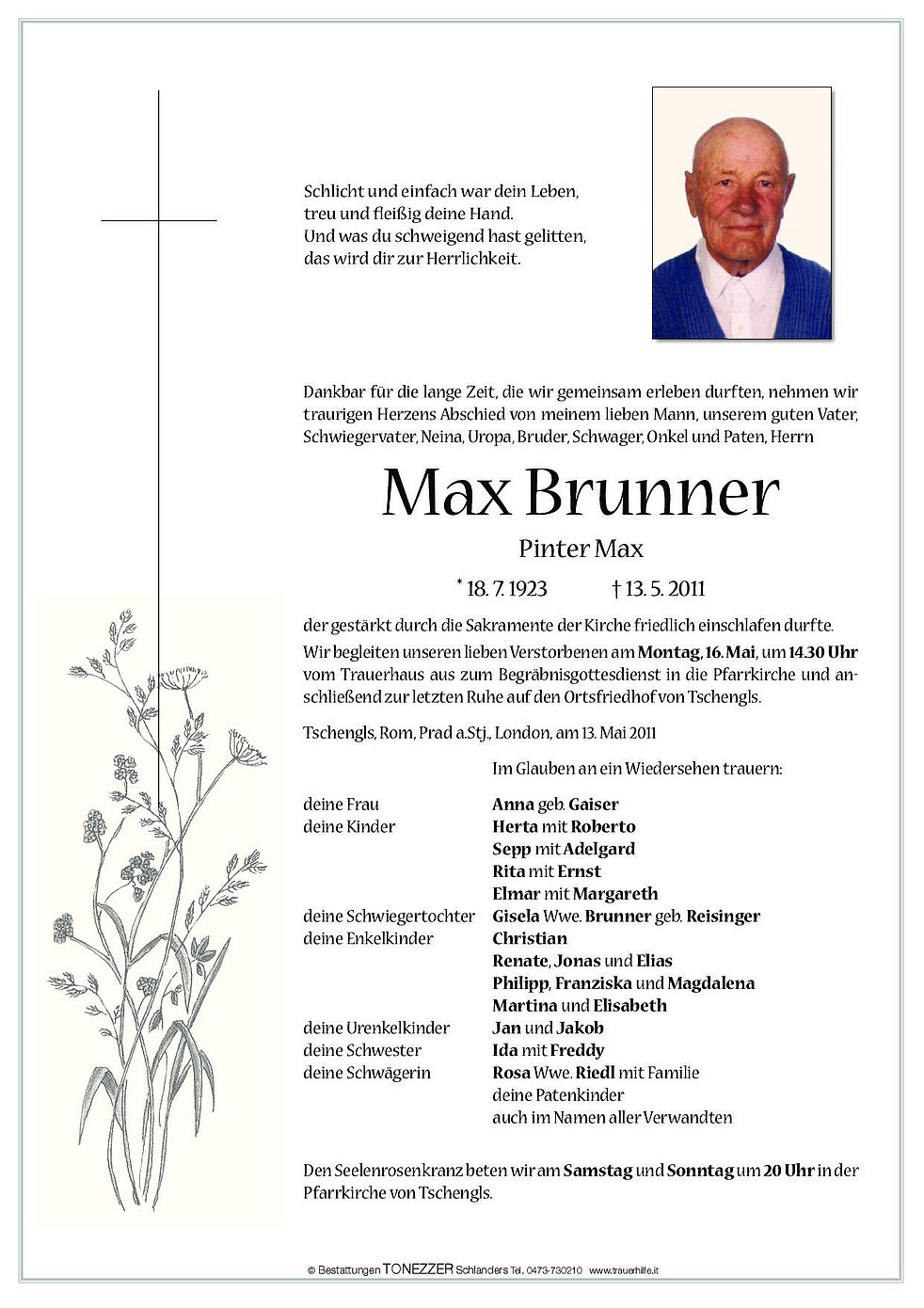 Wir begleiten unseren lieben Verstorbenen am Montag, 16. Mai, um 14.30 Uhr vom Trauerhaus aus zum Begräbnisgottesdienst in die Pfarrkirche und anschließend zur letzten Ruhe auf den Ortsfriedhof von Tschengls.