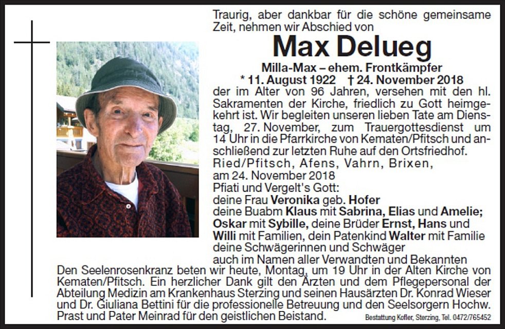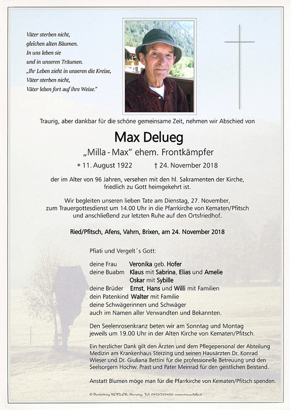 Wir begleiten unseren lieben Tate am Dienstag, 27. November, zum Trauergottesdienst um 14.00 Uhr in die Pfarrkirche von Kematen/Pfitsch und anschließend zur letzten Ruhe auf den Ortsfriedhof.