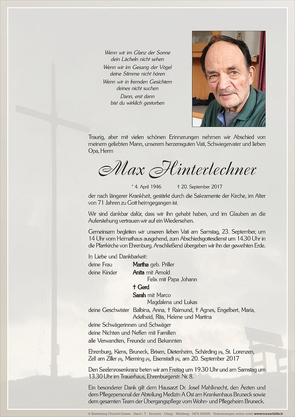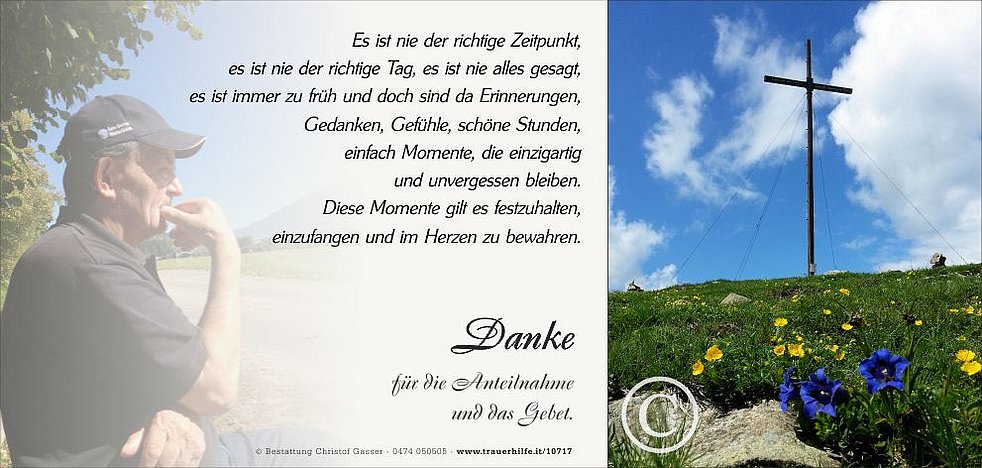 Ein besonderer Dank gilt dem Hausarzt Dr. Josef Mahlknecht, den Ärzten und dem Pflegepersonal der Abteilung Medizin A Ost am Krankenhaus Bruneck sowie dem gesamten Team der Übergangspflege vom Wohn- und Pflegeheim Bruneck.