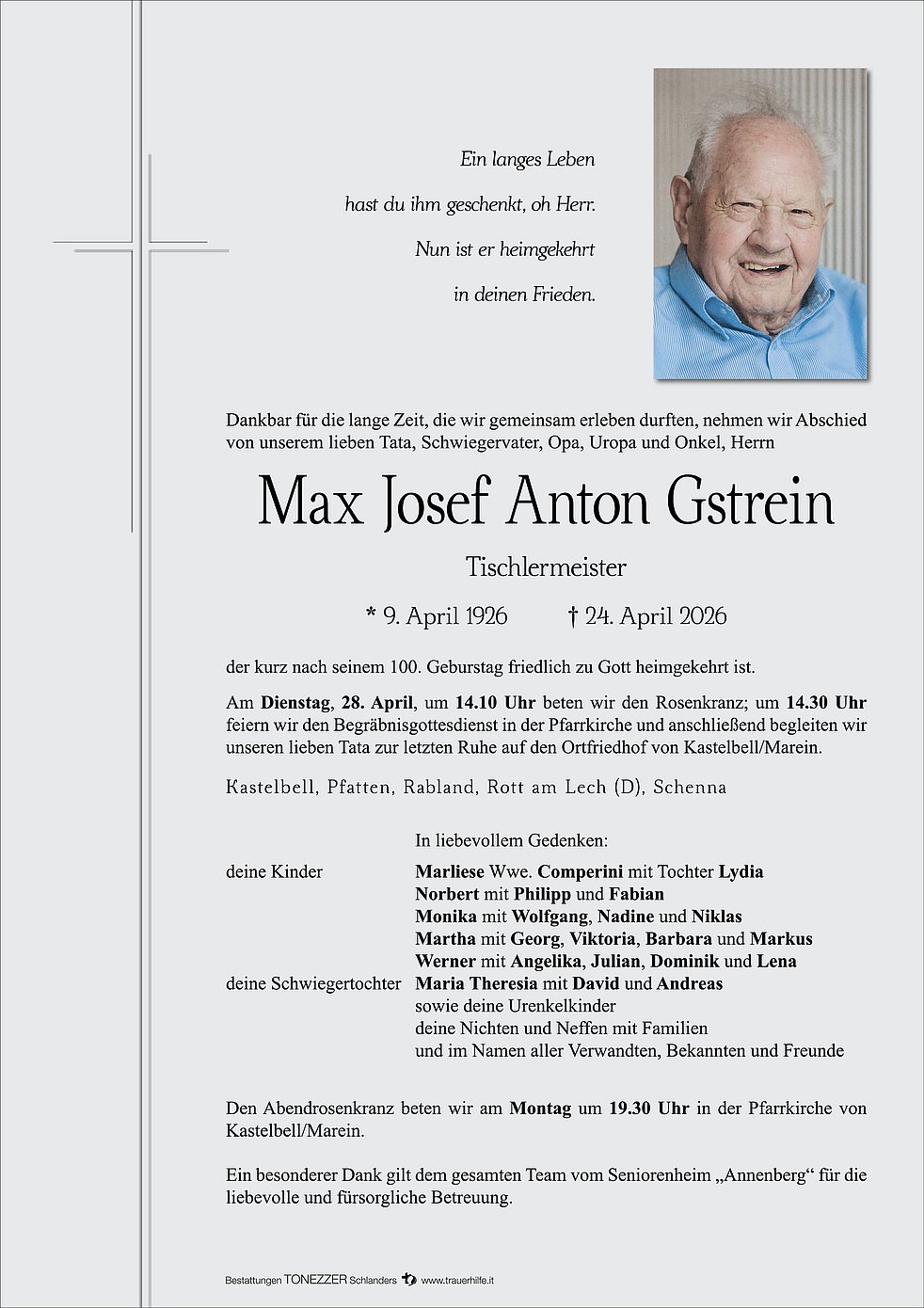 Am Dienstag, 28. April, um 14.10 Uhr beten wir den Rosenkranz; um 14.30 Uhr feiern wir den Begräbnisgottesdienst in der Pfarrkirche und anschließend begleiten wir unseren lieben Tata zur letzten Ruhe auf den Ortfriedhof von Kastelbell/Marein.