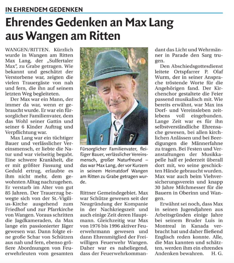 Trauerfeier: 12.08. - 14:30 Uhr Pfarrkirche Wangen