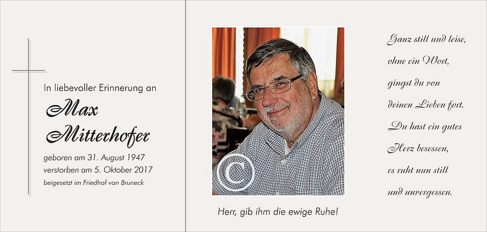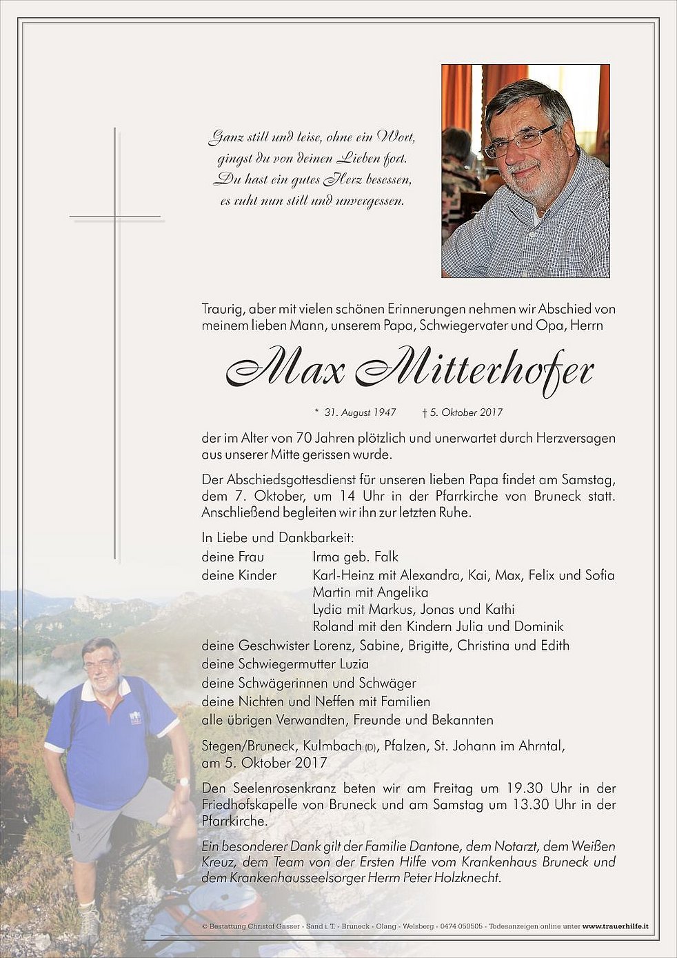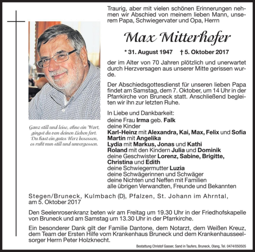 Der Abschiedsgottesdienst für unseren lieben Papa findet am Samstag,dem 7. Oktober, um 14 Uhr in der Pfarrkirche von Bruneck statt. Anschließend begleiten wir ihn zur letzten Ruhe.