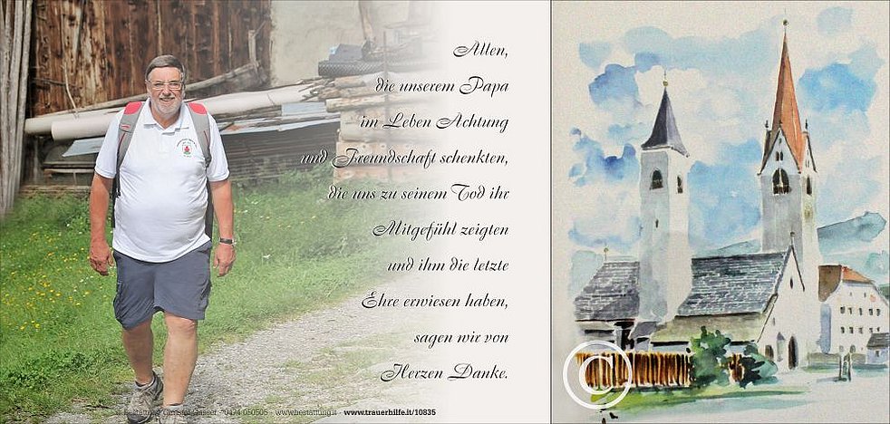 Ein besonderer Dank gilt der Familie Dantone, dem Notarzt, dem Weißen Kreuz, dem Team von der Ersten Hilfe vom Krankenhaus Bruneck und dem Krankenhausseelsorger Herrn Peter Holzknecht.