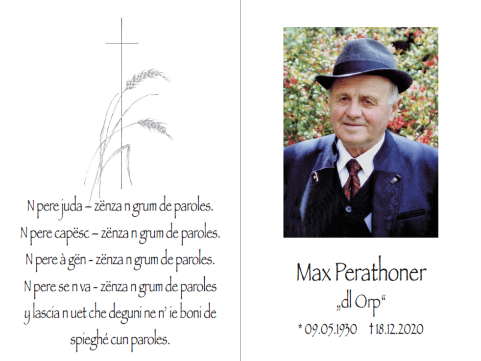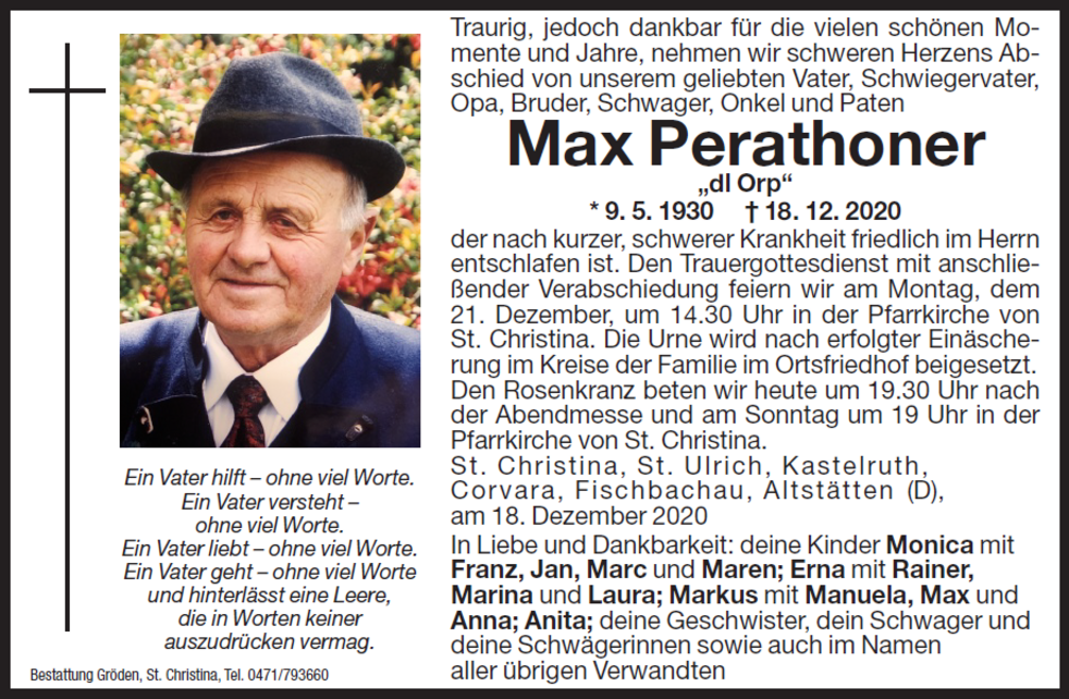 Den Trauergottesdienst mit anschließender Verabschiedung feiern wir am Montag, dem 21. Dezember, um 14.30 Uhr in der Pfarrkirche von St. Christina. Die Urne wird nach erfolgter Einäscherung im Kreise der Familie im Ortsfriedhof beigesetzt.