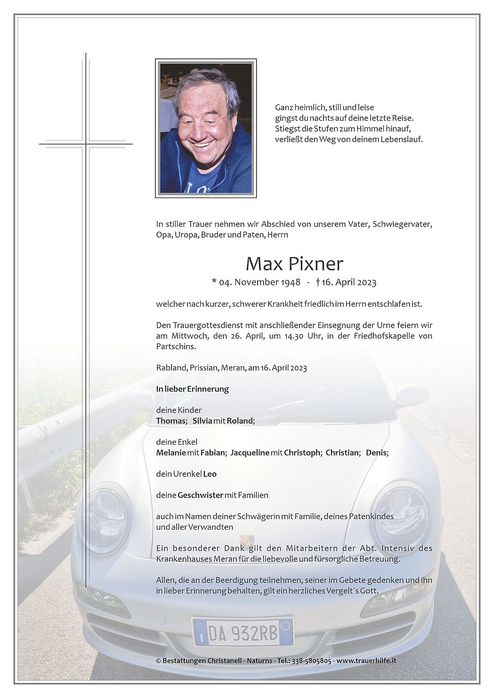 Den Trauergottesdienst mit anschließender Einsegnung der Urne feiern wir am Mittwoch, den 26. April, um 14.30 Uhr, in der Friedhofskapelle von Partschins.