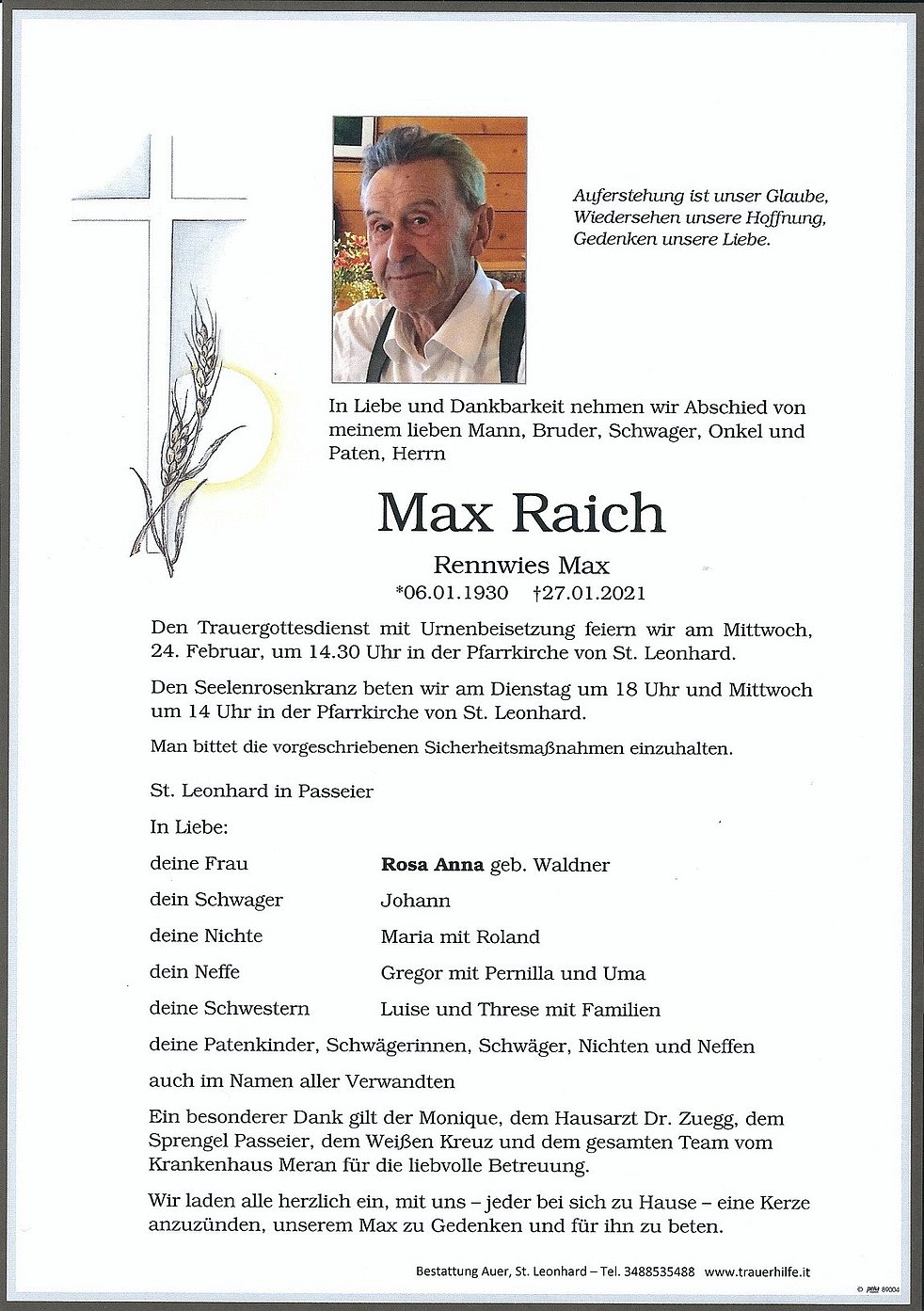 Den Trauergottesdienst mit Urnenbeisetzung feiern wir am Mittwoch, 24.Februar, um 14.30 Uhr in der Pfarrkirche von St. Leonhard