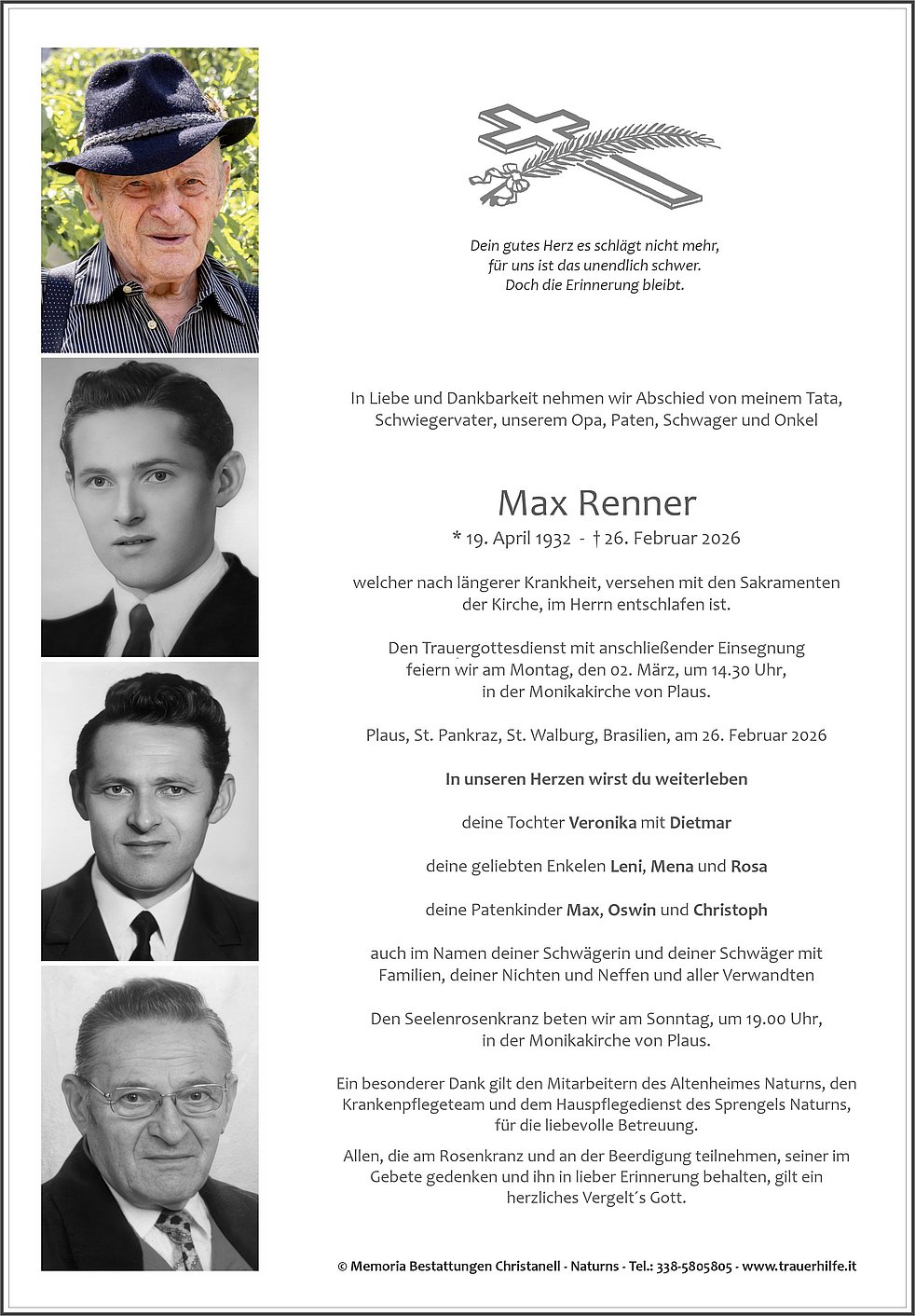 Den Trauergottesdienst mit anschließender Einsegnung feiern wir am Montag, den 02. März, um 14.30 Uhr, in der Monikakirche von Plaus.
