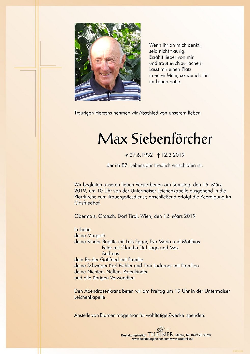 Wir begleiten unseren lieben Verstorbenen am Samstag, den 16. März 2019, um 10 Uhr von der Untermaiser Leichenkapelle ausgehend in die Pfarrkirche zum Trauergottesdienst; anschließend erfolgt die Beerdigung im Ortsfriedhof.