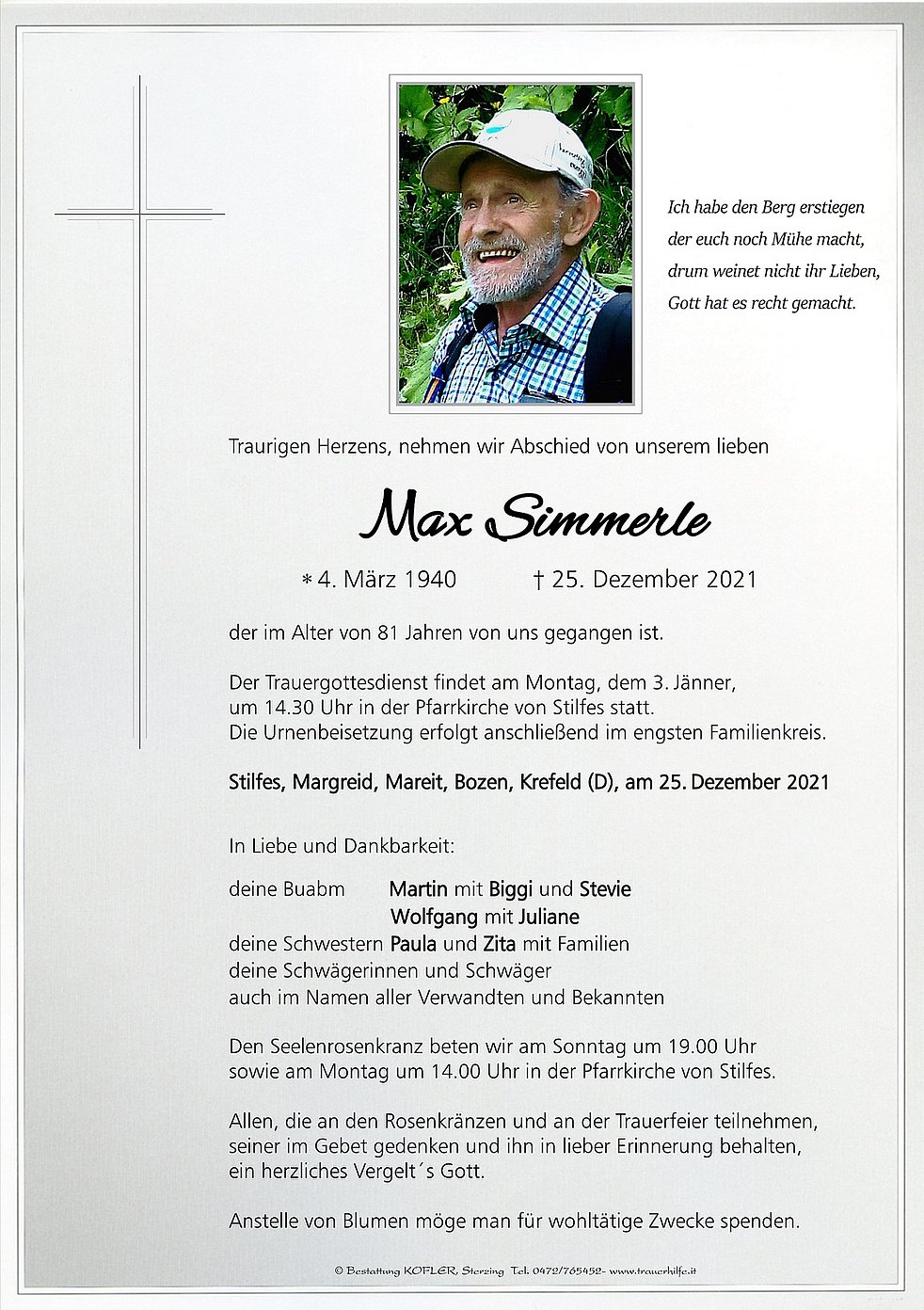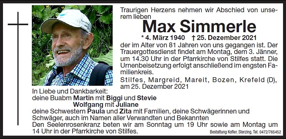 Der Trauergottesdienst findet am Montag, dem 3. Jänner, um 14.30 Uhr in der Pfarrkirche von Stilfes statt. Die Urnenbeisetzung erfolgt anschließend im engsten Familienkreis.