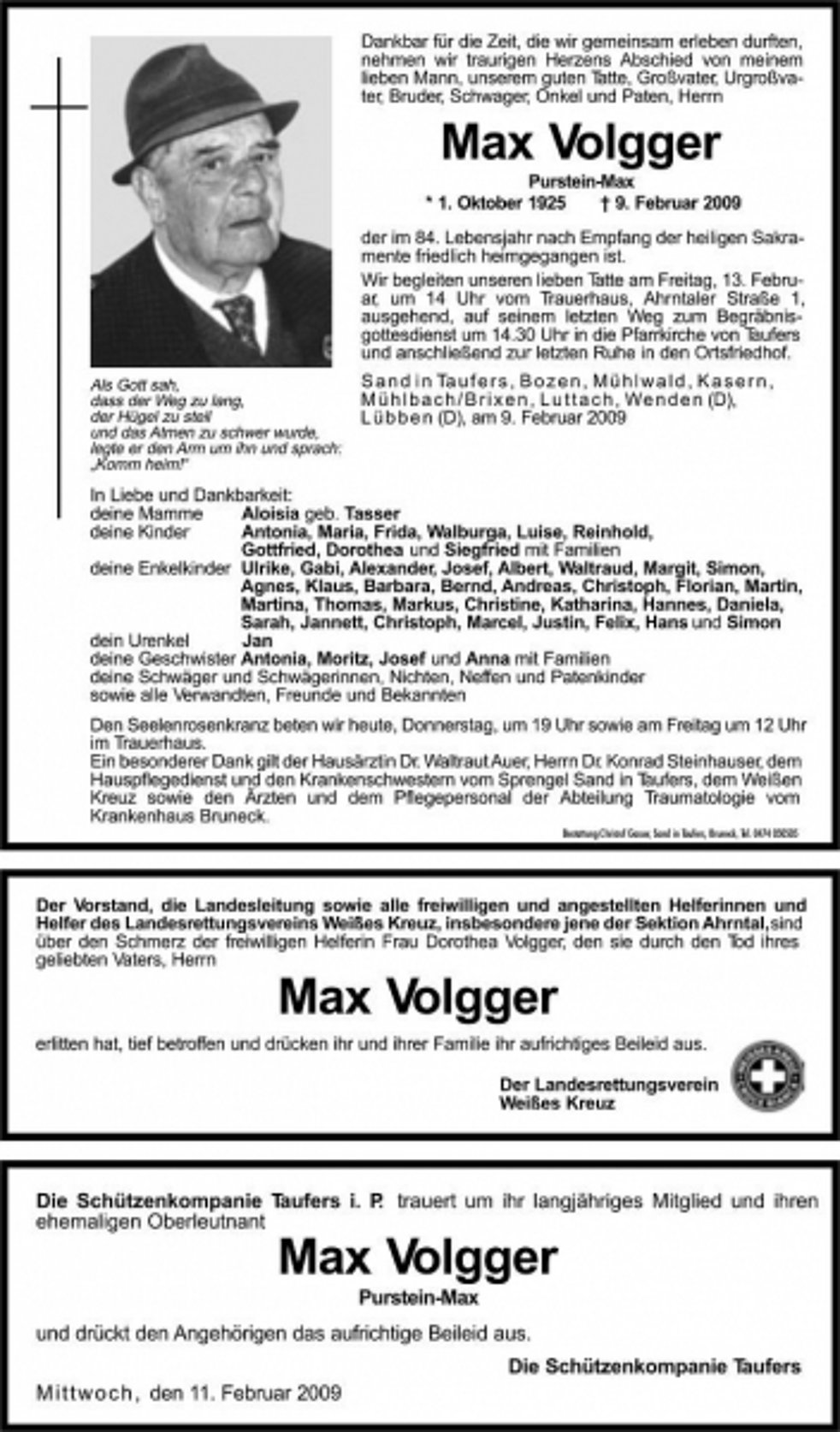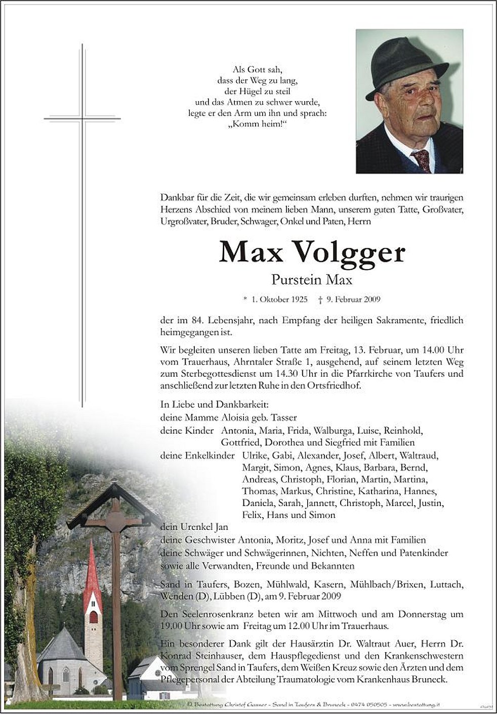 Wir begleiten unseren lieben Tatte am Freitag, 13. Februar, um 14.00 Uhr vom Trauerhaus, Ahrntaler Straße 1, ausgehend, auf seinem letzten Weg zum Sterbegottesdienst um 14.30 Uhr in die Pfarrkirche von Taufers und anschließend zur letzten Ruhe in den Ortsfriedhof.