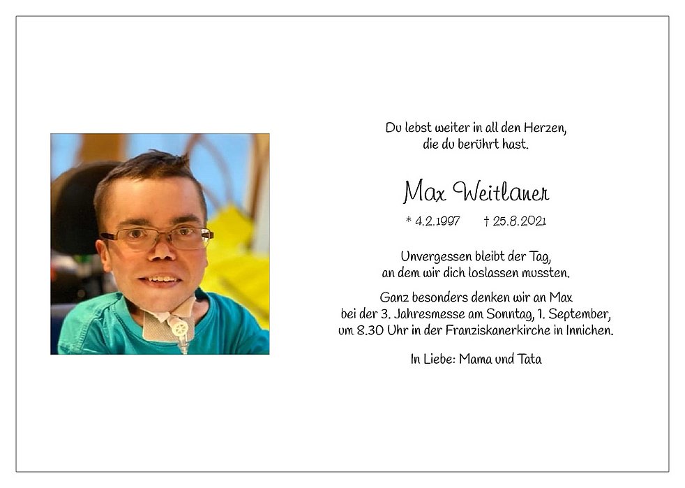 Unser Dank gilt dem gesamten Team von der Abteilung Kinderintensiv an der Uniklinik Innsbruck, dem langjährigen Kinderarzt Dr. Walter Pörnbacher, der Hausärztin Frau Dr. Sabina Molon, Herrn Dr. Zobel und Dr. Pfleger von der Uniklinik Graz und ganz besonders unserer lieben Oberwaldner Beatrice und allen, die Max glücklich gemacht haben.