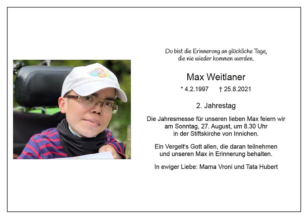 Den Trauergottesdienst für unseren lieben Max feiern wir am Donnerstag, dem 2. September, um 14 Uhr in der Stiftskirche von Innichen; dieser wird über den YouTube-Kanal der Stiftskirche Innichen übertragen.