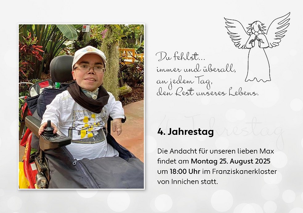 Max ist ab Montagnachmittag im Außerkirchl aufgebahrt. Den Seelenrosenkranz beten wir am Dienstag und Mittwoch um 19.30 Uhr sowie am Donnerstag um 13.30 Uhr in der Stiftskirche.