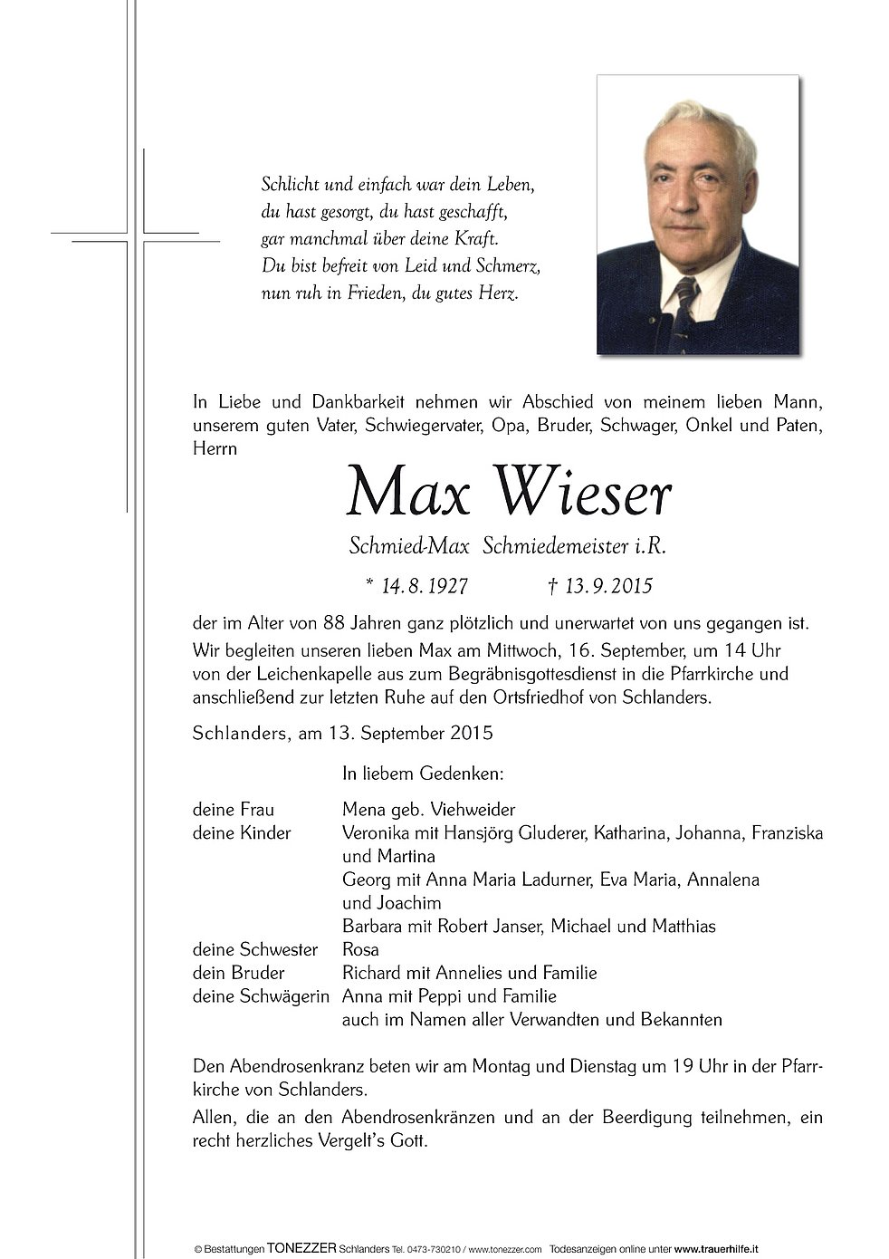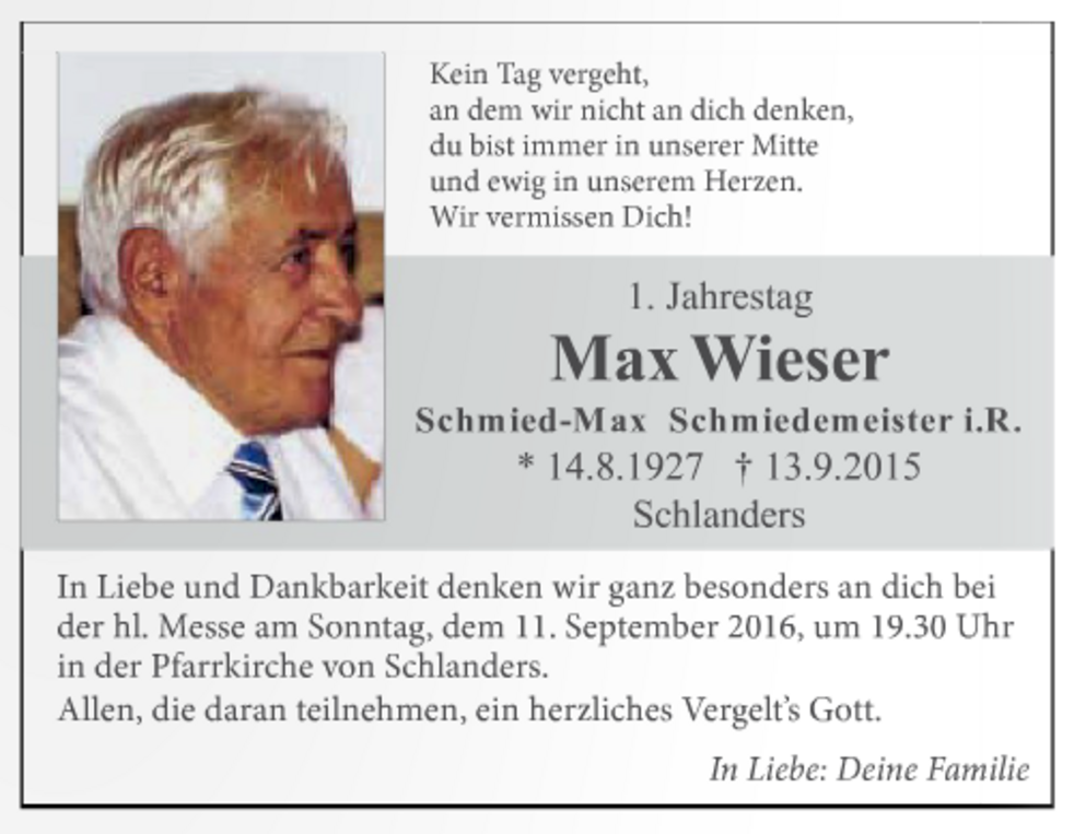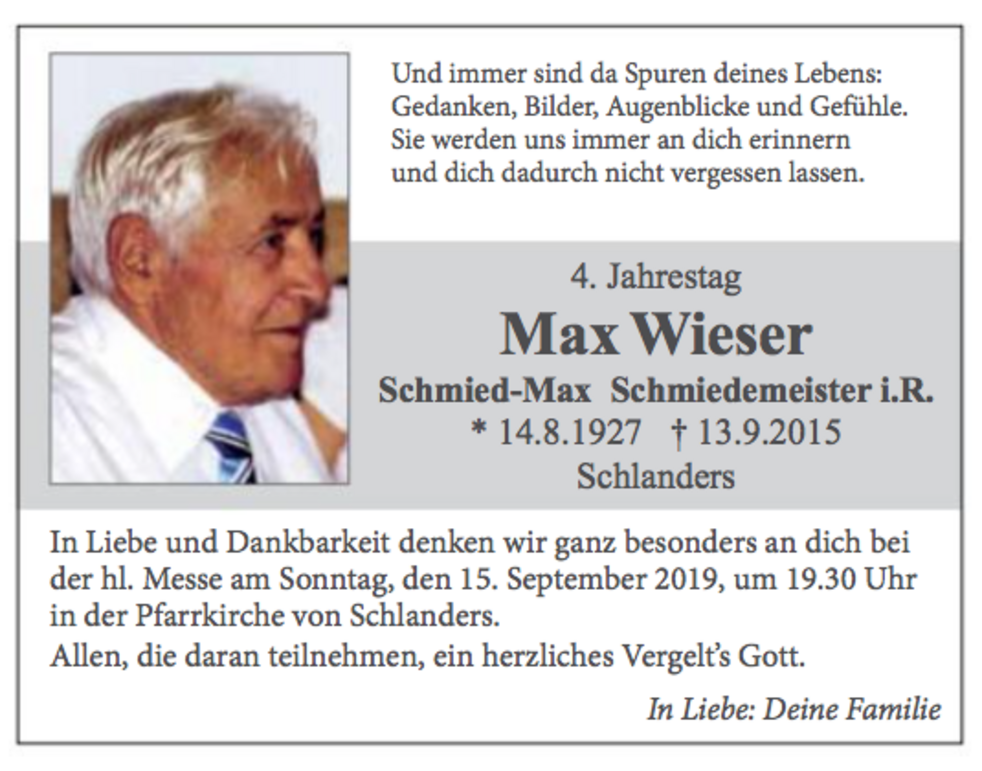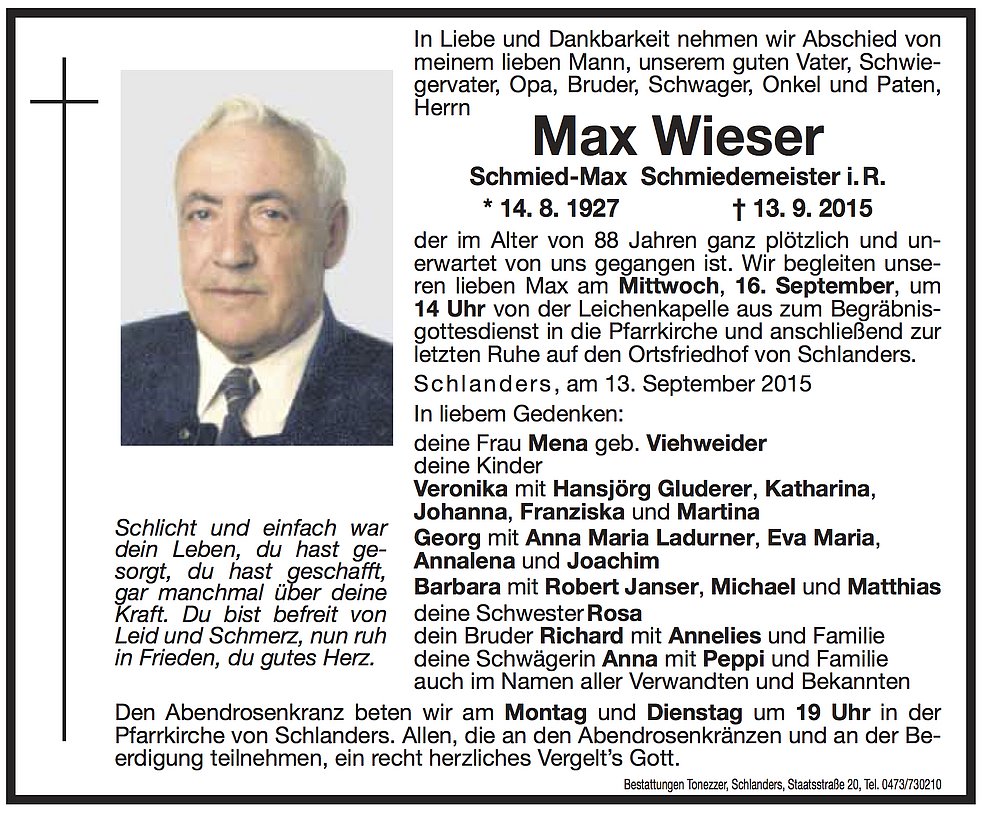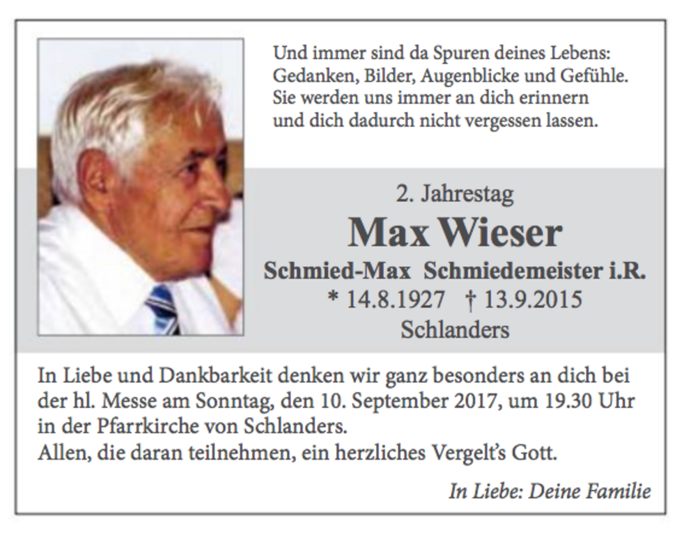 Wir begleiten unseren lieben Max am Mittwoch, 16. September, um 14 Uhr von der Leichenkapelle aus zum Begräbnisgottesdienst in die Pfarrkirche und anschließend zur letzten Ruhe auf den Ortsfriedhof von Schlanders.