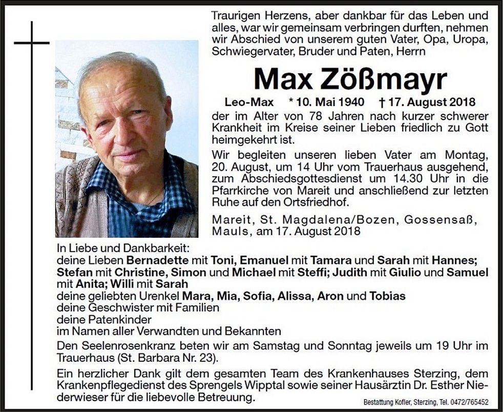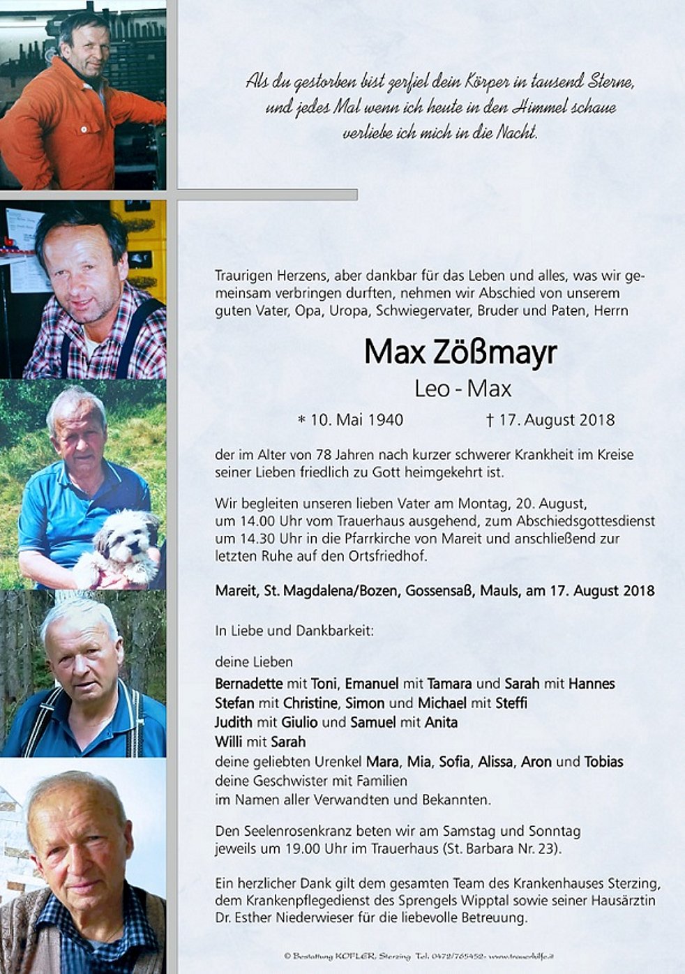 Ein herzlicher Dank gilt dem gesamten Team des Krankenhauses Sterzing, dem Krankenpflegedienst des Sprengels Wipptal sowie seiner Hausärztin Dr. Esther Niederwieser für die liebevolle Betreuung.