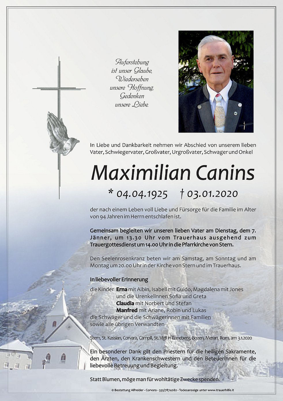Gemeinsam begleiten wir unseren lieben Vater am Dienstag, dem 7. Jänner, um 13.30 Uhr vom Trauerhaus ausgehend zum Trauergottesdienst um 14.00 Uhr in die Pfarrkirche von Stern.