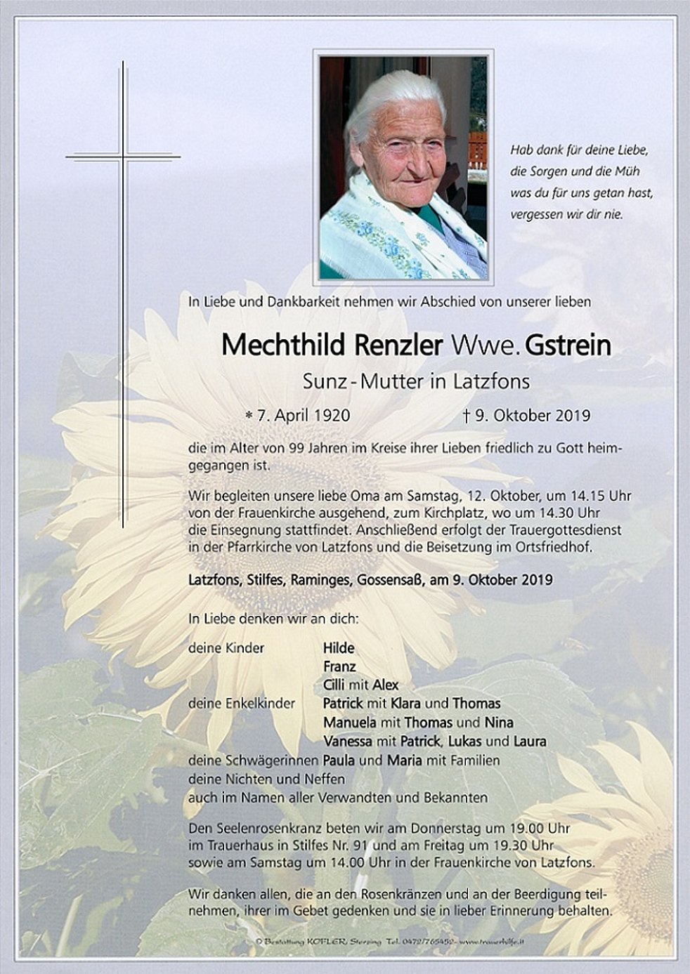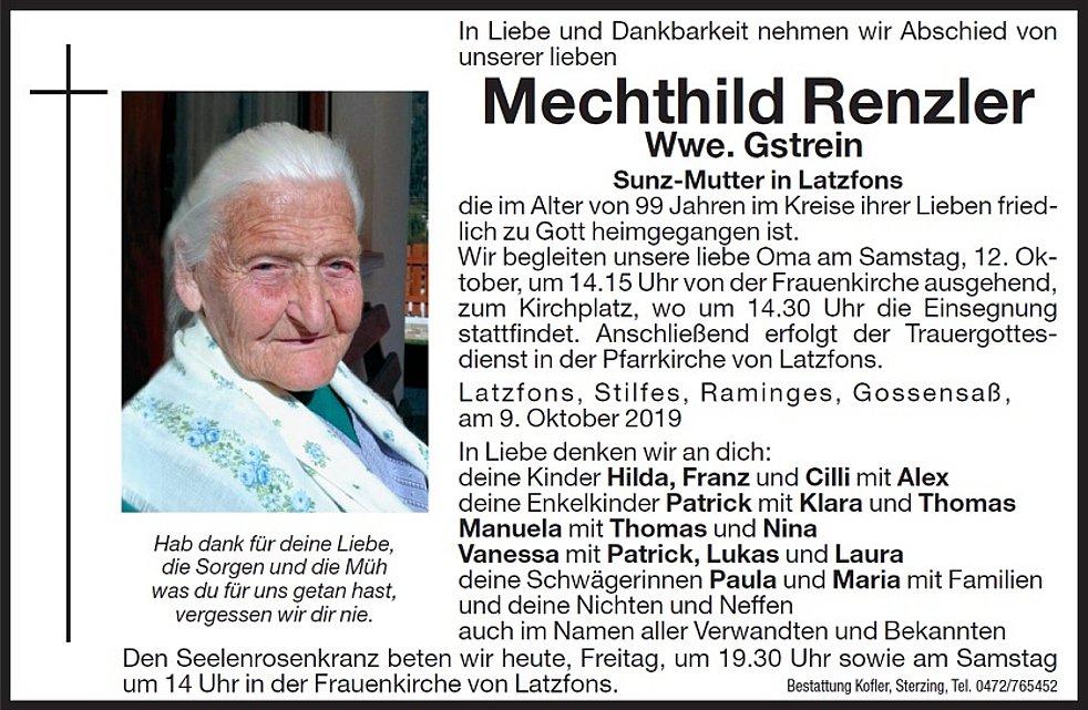 Wir begleiten unsere liebe Oma am Samstag, 12. Oktober, um 14.15 Uhr von der Frauenkirche ausgehend, zum Kirchplatz, wo um 14.30 Uhr die Einsegnung stattfindet. Anschließend erfolgt der Trauergottesdienst in der Pfarrkirche von Latzfons und die Beisetzung im Ortsfriedhof.