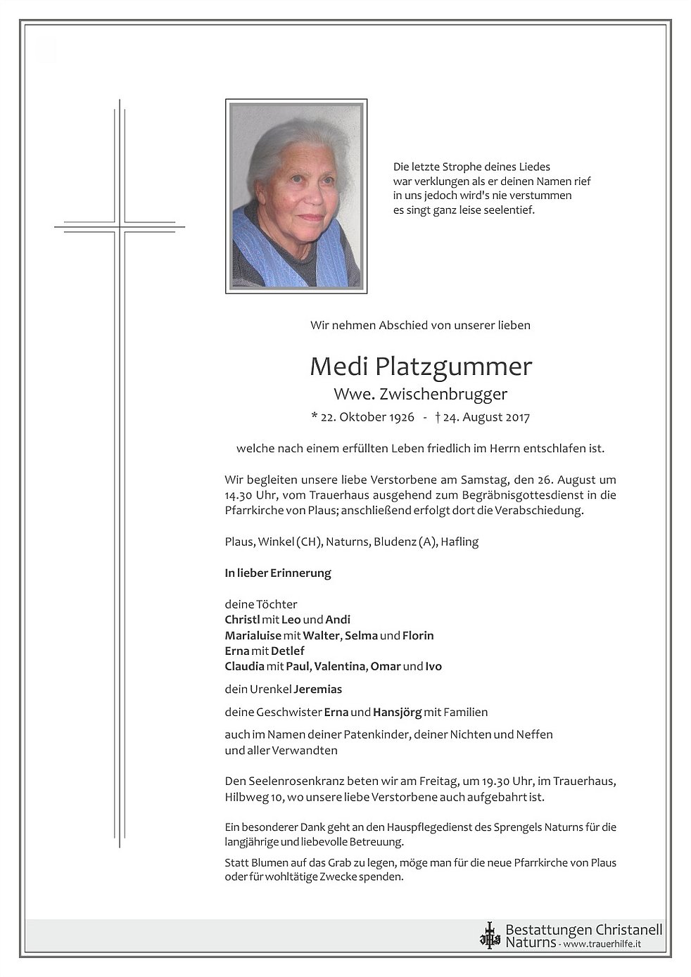 Wir begleiten unsere liebe Verstorbene am Samstag, den 26. August um 14.30 Uhr, vom Trauerhaus ausgehend zum Begräbnisgottesdienst in die Pfarrkirche von Plaus; anschließend erfolgt dort die Verabschiedung.