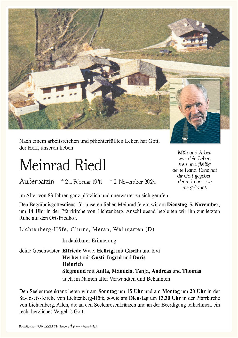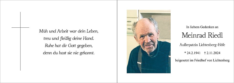 Den Begräbnisgottesdienst für unseren lieben Meinrad feiern wir am Dienstag, 5. November, um 14 Uhr in der Pfarrkirche von Lichtenberg.