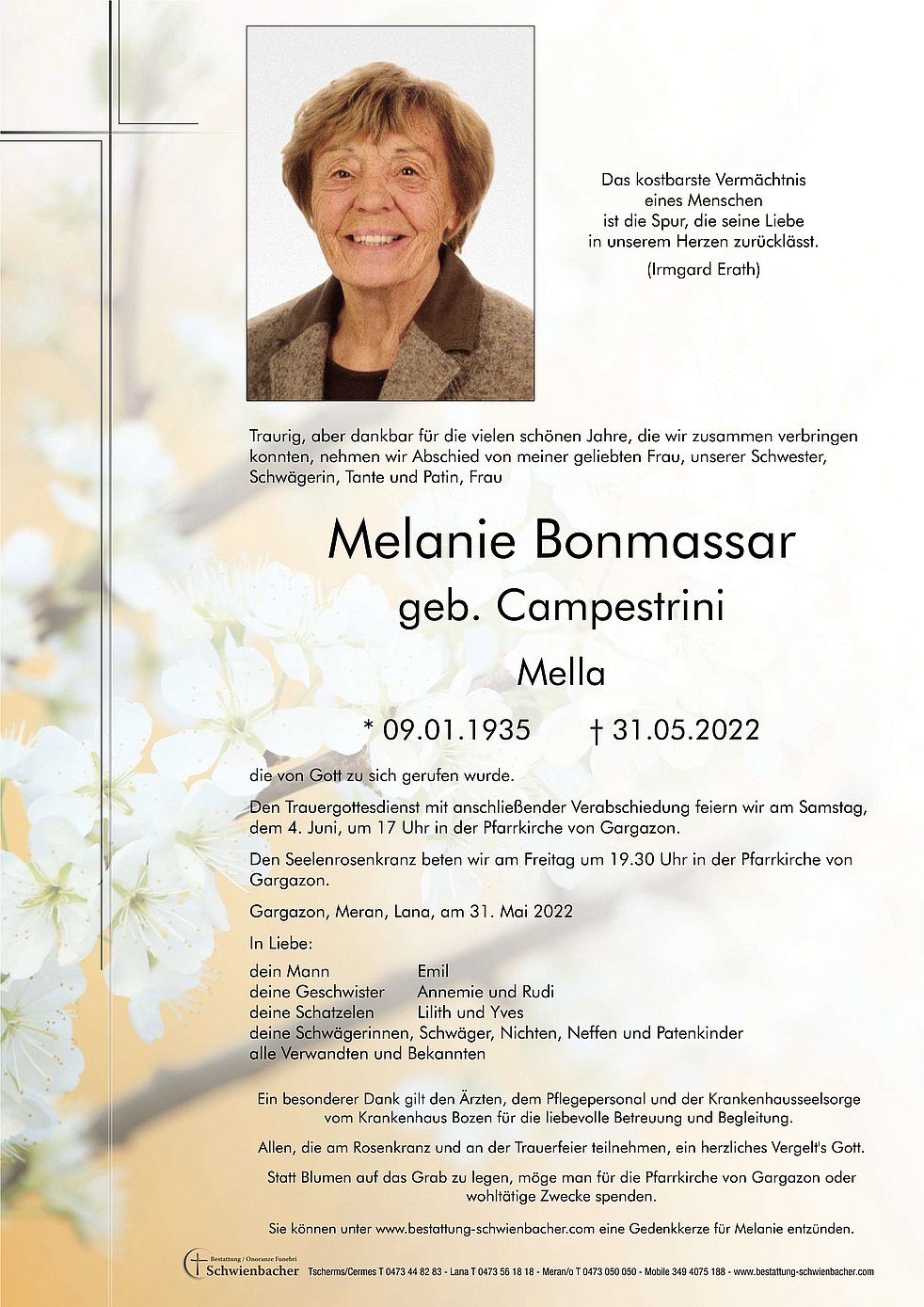 Statt Blumen auf das Grab zu legen, möge man für die Pfarrkirche von Gargazon oder wohltätige Zwecke spenden.